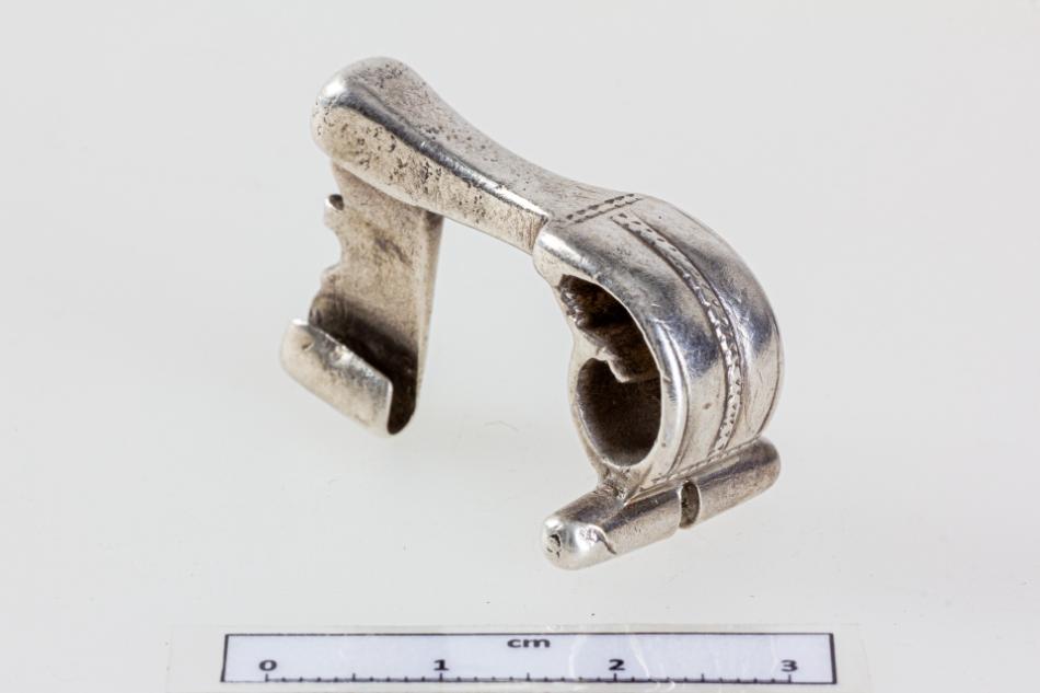 A fibula vagy ruhakapcsoló tű már a bronzkor óta ismert viseleti tárgy, használata szélesebb körben azonban a római korban terjedt el. Anyaga túlnyomórészt bronz, vas, ritkábban ezüst vagy arany, emellett előfordulnak olyan darabok is, amelyeket felületükön vékony rétegben ezüsttel, arannyal vagy fehérfémmel (pl. ón) vontak be. Gyártásuk állami műhelyekben, más bronztárgyakkal együtt történt. A legtöbb esetben a jobb vállon tűzte össze a hordott ruhadarabot, de az is előfordult, hogy párosával (mindkét vállon), vagy a mellkason viselték. A viseleti funkción túl a díszesebb darabok egyfajta kitűzőként, ékszerként is szolgálhattak. A viselet módjára a sírkövek ábrázolásai (1. kép) mellett a csontvázas sírokból előkerült darabok is adatot szolgáltatnak. Változatos formában készültek, továbbá a különböző típusok jó keltező értékkel is bírnak. A jelen darab az ún. térdfibulák közé sorolható, mely nevét a jellegzetes, térd alakban meghajló kengyel után kapta. Az ilyen típusú fibuláknak számos változata volt használatban a 2–3. században. Az itt bemutatott képviselője a kialakítása és felépítése alapján már egy későbbi variáns, keltezése a 2. század végére, a 3. század elejére tehető. Hasonló darabok (2. kép) ismertek az egykori Pannonia és Dacia provinciák területéről, továbbá Singidunumból (a mai Belgrádból), de pontosan ilyen kialakítású fibuláról egyelőre nincs tudomásunk. A tárgy kengyelén megjelenik a peltamotívum, ami a római korban kedvelt díszítőelem volt. A fibulákon kívül alkalmazták még egyéb viseleti tárgyakon (pl.: övveretek, csatok – 3. kép), lószerszámvereteken, valamint ékszereken is. Ezüst anyaga, valamint igényes és egyedi megmunkáltsága alapján feltételezhető, hogy a tárgy egy rangosabb személy tulajdonát képezhette, valamint a rajta megjelenő kopásnyomok azt is felvetik, hogy viszonylag hosszabb ideig használhatták.