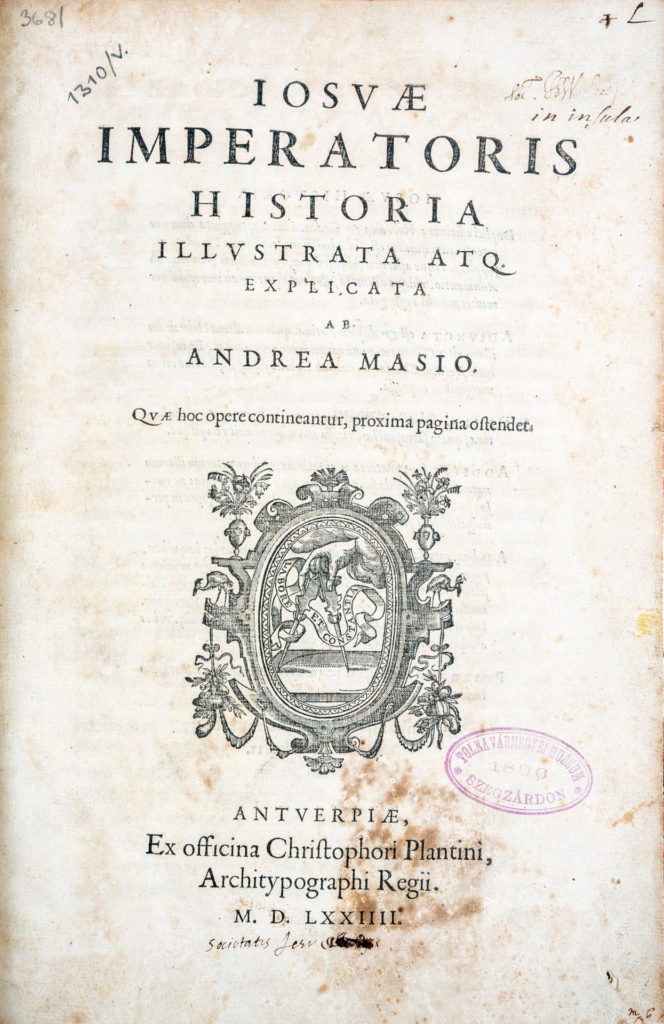 Andreas Masius, aki a mai Belgium területén született, 1514 és 1573 között élt katolikus pap, humanista és a szír tudományok jelentős képviselője volt, aki mindezek mellett a bibliafordításokkal is foglalkozott. Fontos szír nyelvészeti kutatásai voltak, többek között szír szótárt is szerkesztett. Legjelentősebb és a mai napig leginkább értékelt műve Józsué történetének megírása. A mű az ószövetségi Józsué vezér történetét dolgozza fel, aki az ókori zsidók vezetője volt honfoglalásuk idején, valamint Mózes utódja, aki átvezette népét a Jordánon és meghódította Kánaánt. A róla elnevezett szentírási Józsué könyve Kánaán meghódításának kezdetétől a Józsué haláláig terjedő időszakot meséli el. Masius műve több fejezetből áll: Józsué történetét héber és görög nyelven írja le latin fordításokkal, részletes magyarázatokkal és a bibliafordításokkal is foglalkozó bevezetővel. Az egyes nagyobb egységek díszes iniciáléval kezdődnek. A kötetet többféle mutató, jóváhagyás és II. Miksa német-római császárnak szóló ajánlás zárja. A kötet már csak Masius halála után jelent meg. Vitatott volt szabad magyarázatai, bibliafordítási és bibliaértelmezési gondolatai miatt.