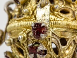 A tavalyi 2020-as év elején Mészáros Péter ajándékaként egy aranyozott ezüstből készült fátyoltű került a Wosinsky Mór Megyei Múzeum régészeti anyagába. A tű Cikó és Ófalu határában a 17. században elpusztult Eszterpusztán került elő, a rezgőtűk csoportjába tartozik, melyek a tűkön lévő kis csüngődíszek mozgásáról kapták a nevüket. Az eszterpusztai fátyoltű hossza 14,7 cm, gömbtagjának átmérőjű 2,7 cm, két darab vékony falú, áttört félgömb alkotja (1-2. kép). A két félgömb között borda, a tetején négyágú csúcsos dísz található. A felső- és alsó részén négy-négy csüngős tag volt eredetileg, a felső részről egy kiszakadt, az alsó részről is hiányzik kettő. A csüngőket foglalatos vörös kövek díszítik. A gömbtesten szintén négy-négy foglalatos kő helyezkedik el a gömbdísz alsó és felső felén. A gömb felületét, fonatmintás íves vonalak díszítik. Ezek a gömbtesten lévő köves foglalatok körül homorú ívű rombusz alakzatot alkotnak, melyet egy kör alakú fonat fog közre. A rombusz csúcsi és a körvonal találkozásainál egy-egy gyöngyöt utánzó gömböcske található. A rombusz keretein belül, szimmetrikusan négy apró kör alakú fonatdísz helyezkedik el, melyek tengelyében található a foglalatos kő (3. kép). A csöngőtagok nem rombusz alakzatból indulnak ki hanem homorú háromszöget alkotó fonatminta közepéből. A háromszöget, boltíves fonat fogja közre, a háromszögek csúcsai és a boltívek metszéspontjában itt is egy-egy gyöngyutánzat található. A csüngőtagok elnyújtott téglalap formájúak, melyeknek az alja egyenesen, derékszögben levágott a teteje viszont íves (4. kép).