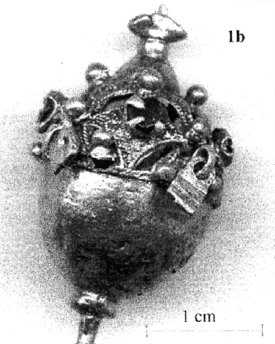 Nagyban hasonló tűk több lelőhelyről is előkerültek. A Balassagyarmat – Bercsényi utcai gömbtagos fátyoltű aranyozott ezüstből készült. A gömbdísz felső tagján négy levélből álló kivágás látható melyek közé négykarmú rekeszekbe egy-egy gránátkövet követ foglaltak. A négylevelű kivágások alatti függőleges karikákba egy-egy páros vízszintes bevágással tagolt lemezes csüngőt, lakatdíszt helyeztek (5. kép). A Bercsényi utcában a 26. sz. ház előtti gerincvezeték szakaszon előkerült Mátyás kori 1488 körül vert ezüst obulus és az ettől nem messzire előkerült II. Ulászló (1471-1516) pfennig, a hajtűt fenntartásokkal a 15. század végére a 16. század elejére datálja. Bárdudvarnokon a 291. sírban eltemetett nő koponyájánál hét darab ezüstből illetve bronzból készült tűt találtak. Öt tű végén kis kéttagú gömböcske volt. A hatodik tű feje kisebb méretű aranyozott gömb volt. A legnagyobb, hetedik tű végén nagyméretű aranyozott gömb helyezkedett el, melynek két fele között borda, a tetején csúcsos dísz látható, a foglalatokban tizenhat darab kék és fehér kő volt. A foglalatok egyik fele nem közvetlenül a gömbön, hanem az arról lógó kis lapocskákon, csüngőkön lett kialakítva (6. kép). Tág időhatárok közé a 16-18. századra keltezhető. A Kaposvár 61. úti temető, 772. sírjából két fátyoltű került elő, ezek közül az egyik rezgőtű volt (7. kép). A 773. sírból a három darab fátyoltű közül kettő csüngős tagokkal volt díszítve (8. kép). A fátyoltűs sírok közeléből a 770. sírból II. Mátyás (1608-1619) dénárja került elő. Ez a 17. század első felére keltezheti az említett sírokat. Utolsóként említésre méltó még a Drégelypalánkon talált kincsleletet egyik hajtűje melyen szintén csüngős díszek találhatóak és nagyban hasonlít az eszterpusztaihoz, de a leletekkel kapcsolatban további támpontunk nincs (9. kép).