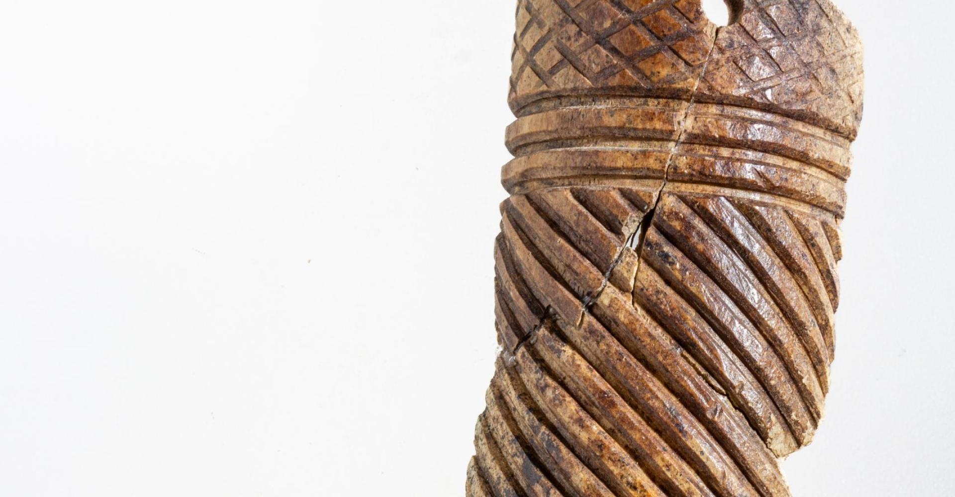 A lelet három darabból ragasztott, a Kr. e. 7. század második felére keltezhető. A csizmadarabbal együtt gyűjtött tárgyak között egészen sajátos egy másik faragvány története is. A ferde- és körbefutó kannelúra-köteggel díszített csonthengerbe az egykor a telken lakó férfiember másodlagosan szőrt dugott, és borotvapamacsnak használta. Az elnéptelenedett házban a rag alól került elő. További, hasonló technikával díszített faragványok töredékei is szép számban vannak az anyagban. Mindezek teljesen egyedülálló leletek a Kárpát-medencében, mint a ferdén, szélesen kannelúrázott töredékek, köztük az egyik 4 cm hosszú, 1,5 cm széles félhengeres tárgy részlete, valamint a pikkelypáncélzat alsó díszítősorához tartozó, geometrikus díszítésű, trapéz alakú lemez is. Egy vékony falú, egész felületén nagyon finom geometrikus mintákkal díszített tárgyon pedig különösen jól látható a piros színű festés nyoma. A faragványok mintegy harmada pontkörös díszítésű. A korabeli ábrázolásokon jól látható, hogy a puha bőrből varrt, felfelé kunkorodó orrú csizma az ókori Keleten és a sztyeppén a szkítáknál is széles körben elterjedt. A regölyi pannon tumulus feltárása során további szarvasagancsból készített votív csizmafaragvány is előkerült, melyen szintén jól megfigyelhető az egykori viselet: mindkét esetben olyan ballábas faragvány került elő, amelyen puha bőrből varrt, felkunkorodó orrú csizma látható.