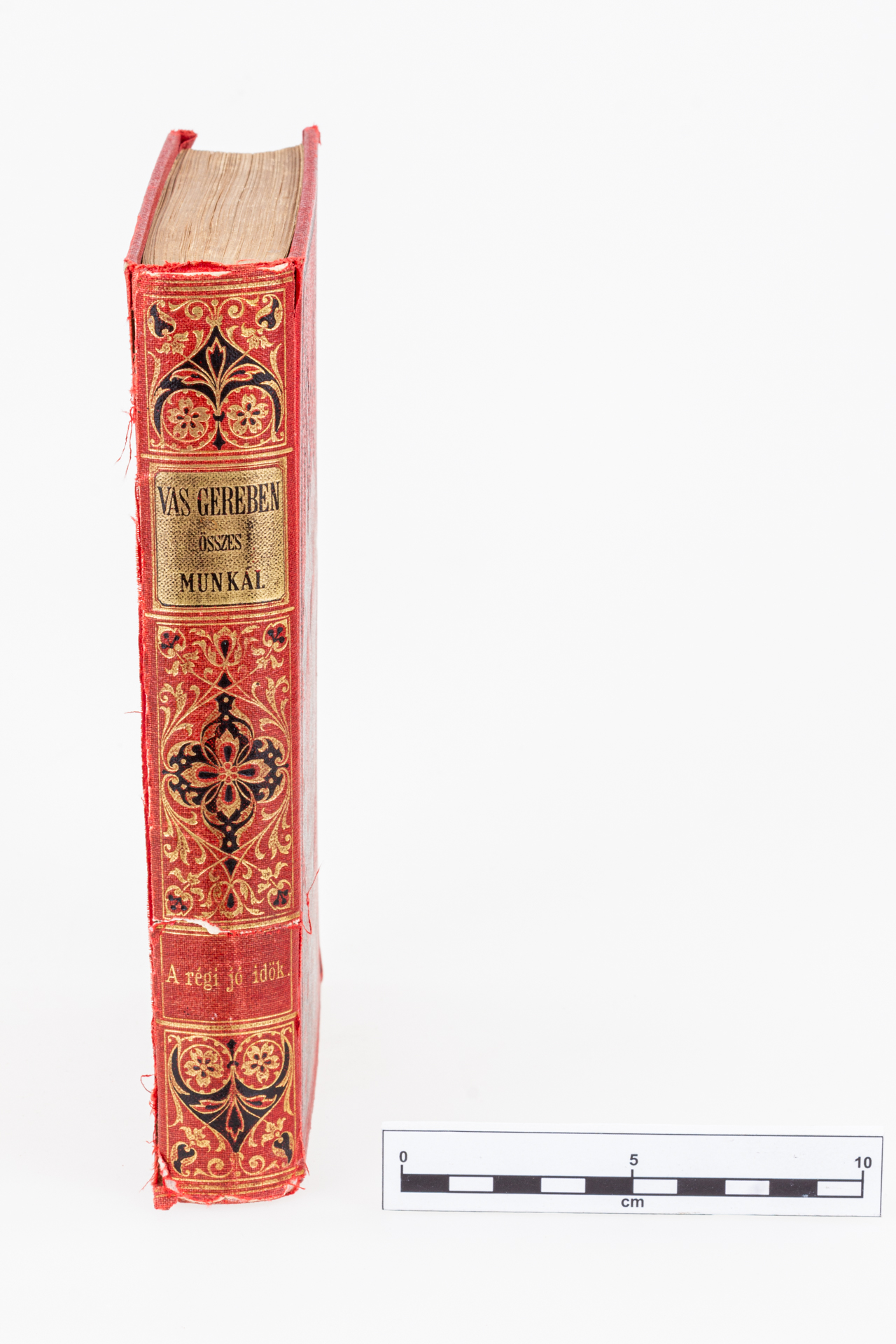 A kiállított könyv adatai: Kiadás helye, ideje: Budapest, 1886 Kiadó: Franklin Társulat, 4. kiadás Mérete: 20x15 cm Oldalak száma: 492, számos fekete-fehér szövegközi és néhány egész oldalas illusztrációval Típus: nyomtatott könyvlapok; aranyozott gerincű kiadói egészvászon-kötés; a borítón dombornyomás; állapota kopottas Teljes cím: Vas Gereben összes munkái. Képes kiadás. I. kötet.