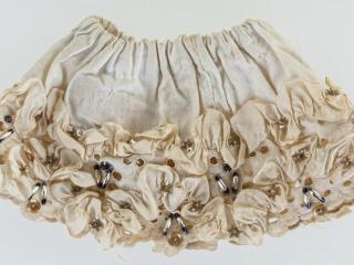 A hónap műtárgya a cintányéros pillék közé tartozik, de visszafogottabb stílusán érezhető, hogy az 1930-as években készült. A karton kontydobozra húzott fehér taftselyem anyagra virágszirom és korong alakú flittereket, továbbá fehér üveggyöngyöket varrtak, melyek alakja stilizált virágformát mutat.