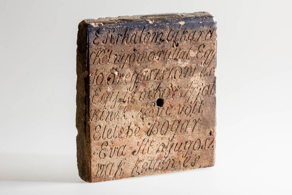 Leírás: Égetett tégla, négyzet alakú. Egyik lapján belekarcolt felirat: „E sírhalom takara két nyomorultat. Egy jó öregasszont és egy jámbor ifjat, kinek neve volt életében Bogár Éva. Itt nyugszanak ketten és (…)” A szöveg folytatása hiányzik, ugyanis két tégla alkotta annak idején a sírfeliratot. Ennek ellenére egy kis kutatással kideríthető a hiányzó adat a sárpilisi és az őcsényi református anyakönyvekből. Bogár Éva 1808. május 21-én született Őcsényben. A sárpilisi származású Vecsei István vette feleségül, aki 1844 januárjában meghalt. Bogár Éva sógornője, Mária is ugyanekkor halt meg. Még ebben az 1844. januári hónapban házasságot kötött az özvegy sógor, Kovács Sándor és az özvegy sógornő, Bogár Éva. A korban késeinek számító házasságukból egy gyermek született 1845-ben, Sándor, aki 1863 augusztusában, 18 évesen elhunyt. Tehát az ő személyét rejtik a „jámbor ifjú” szavak. Bogár Éva 1873-ban halt meg 62 évesen, férje 1880-ban követte őt ,78 éves korában.