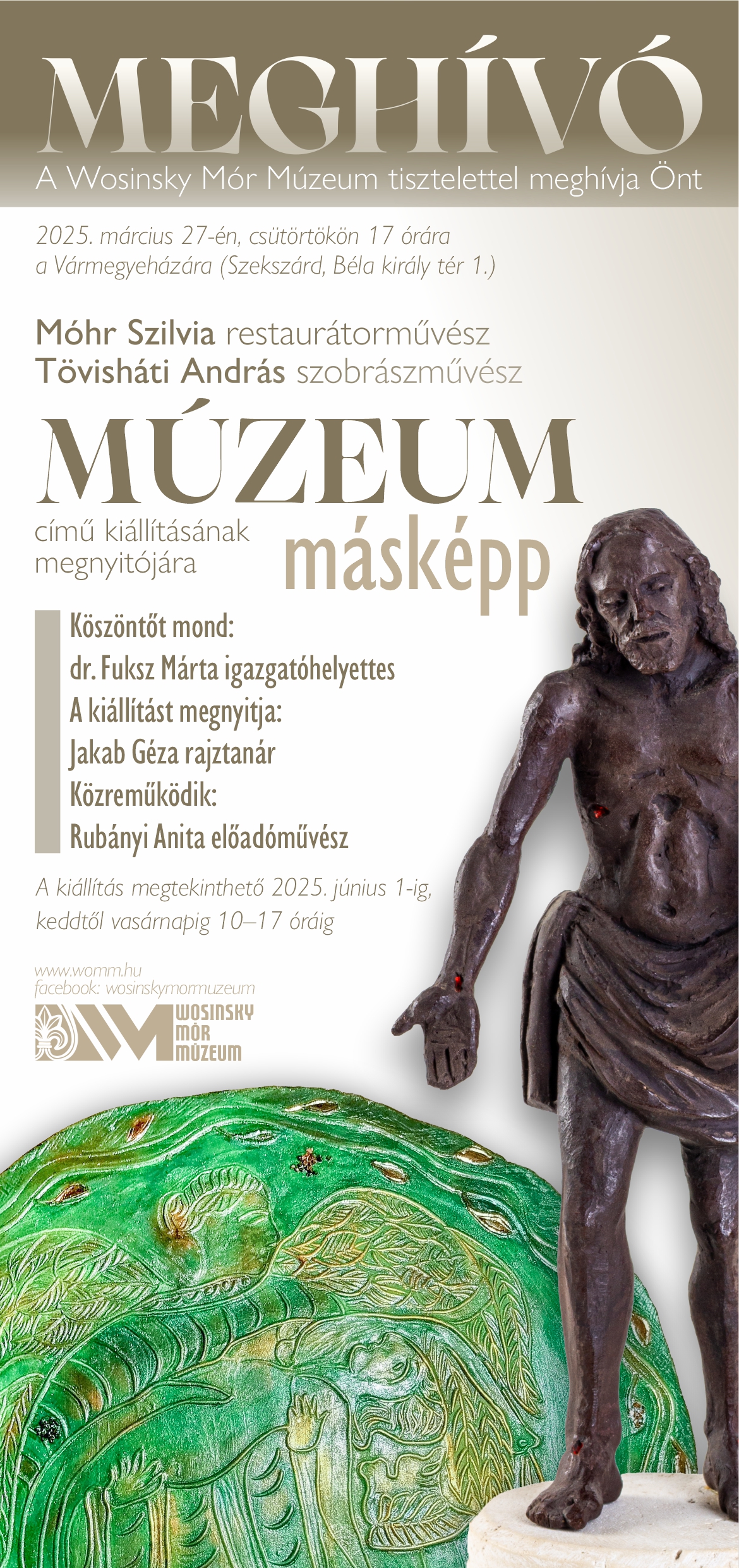 Végéhez közeledik a "Múzeum másképp" időszaki kiállítás a Wosinsky Mór Múzeumban. A Móhr Szilvia és Tövisháti András alkotásaiból nyílt tárlatban a művészek várják személyes tárlatvezetéssel az érdeklődőket 2025. május 31-én, szombaton, 15 órától a Vármegyeházán (Szekszárd, Béla tér 1.)