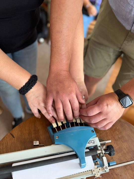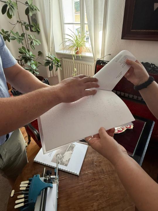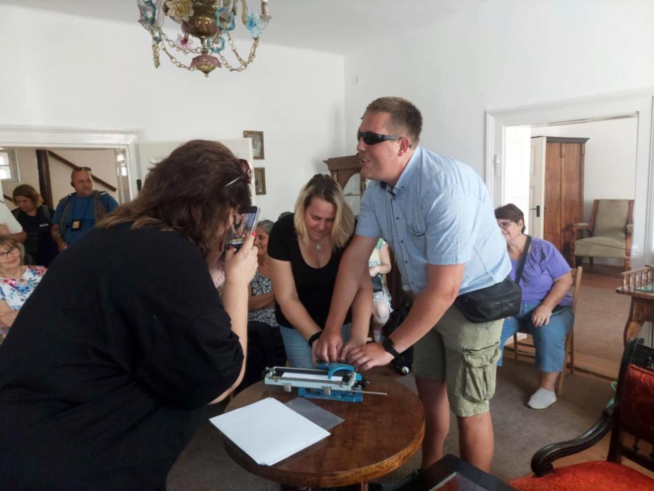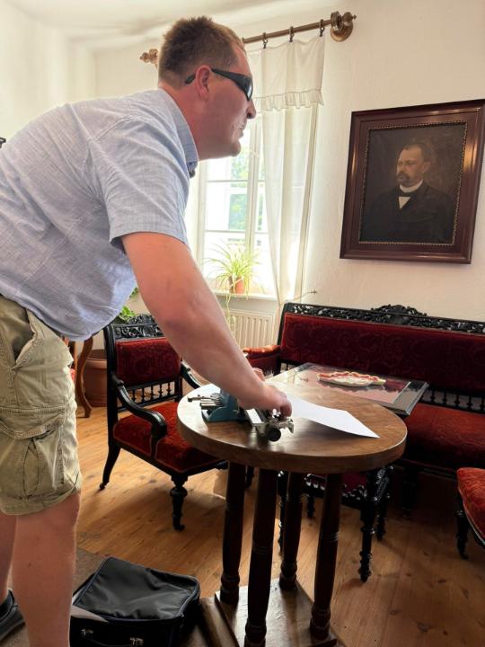 Bálványossy Zoltán, az egyesület akadálymentesítési koordinátora, felolvasta az átiratról a Babits-vers első versszakát, majd elkészítette munkatársunk Braille írású névjegyét és röviden bemutatta a Braille írógép használatának, valamint a pontírás olvasásának módszerét is. Ezt követően Rubányi Anita múzeumpedagógus adta elő a Babits-verset, majd Rákóczi Szilvia egyesületi tag énekelt a költő szülőházának szalonjában.