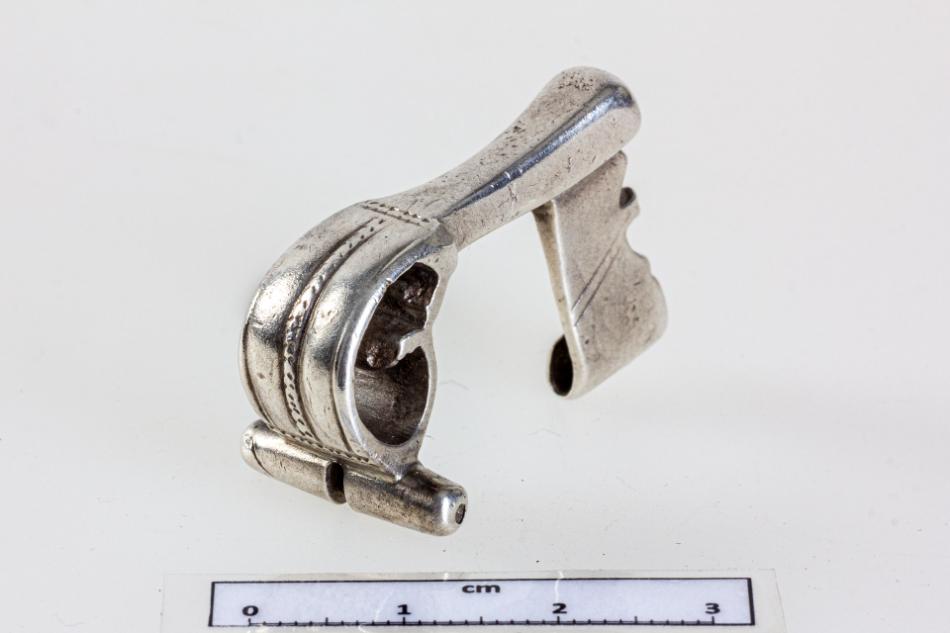 A fibula vagy ruhakapcsoló tű már a bronzkor óta ismert viseleti tárgy, használata szélesebb körben azonban a római korban terjedt el. Anyaga túlnyomórészt bronz, vas, ritkábban ezüst vagy arany, emellett előfordulnak olyan darabok is, amelyeket felületükön vékony rétegben ezüsttel, arannyal vagy fehérfémmel (pl. ón) vontak be. Gyártásuk állami műhelyekben, más bronztárgyakkal együtt történt. A legtöbb esetben a jobb vállon tűzte össze a hordott ruhadarabot, de az is előfordult, hogy párosával (mindkét vállon), vagy a mellkason viselték. A viseleti funkción túl a díszesebb darabok egyfajta kitűzőként, ékszerként is szolgálhattak. A viselet módjára a sírkövek ábrázolásai (1. kép) mellett a csontvázas sírokból előkerült darabok is adatot szolgáltatnak. Változatos formában készültek, továbbá a különböző típusok jó keltező értékkel is bírnak. A jelen darab az ún. térdfibulák közé sorolható, mely nevét a jellegzetes, térd alakban meghajló kengyel után kapta. Az ilyen típusú fibuláknak számos változata volt használatban a 2–3. században. Az itt bemutatott képviselője a kialakítása és felépítése alapján már egy későbbi variáns, keltezése a 2. század végére, a 3. század elejére tehető. Hasonló darabok (2. kép) ismertek az egykori Pannonia és Dacia provinciák területéről, továbbá Singidunumból (a mai Belgrádból), de pontosan ilyen kialakítású fibuláról egyelőre nincs tudomásunk. A tárgy kengyelén megjelenik a peltamotívum, ami a római korban kedvelt díszítőelem volt. A fibulákon kívül alkalmazták még egyéb viseleti tárgyakon (pl.: övveretek, csatok – 3. kép), lószerszámvereteken, valamint ékszereken is. Ezüst anyaga, valamint igényes és egyedi megmunkáltsága alapján feltételezhető, hogy a tárgy egy rangosabb személy tulajdonát képezhette, valamint a rajta megjelenő kopásnyomok azt is felvetik, hogy viszonylag hosszabb ideig használhatták.