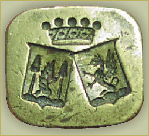 Lekerekített sarkú, téglalap alakú pecsétnyomó, fogantyúja négyzetes, az összeillesztésénél hengeres. A pecsétnyomón két címerpajzs, felső sarkuknál ferdén egymáshoz döntve. A bal oldali pajzson hármas halom két szélsőjén pálmafa áll, a középsőn jobbra fordított szárny,nyíllal rézsúton átlőve. A jobb oldali címerpajzson hármas halom középsőjén griff ágaskodik, a címerállat szembenéz a másik pajzzsal. Felettük ötágú, nemességet jelölő korona. Pecsét készítésekor kapunk pozitív képet.