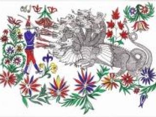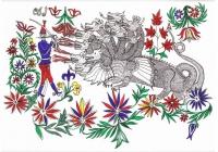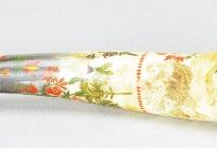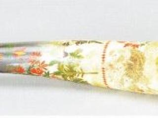 Ökörszarvból, ráöntött ónfúvókával, gazdag virág- és figurális karcolt dísszel, piros, zöld, kék, sárga, fekete spanyolozással készült tárgy.