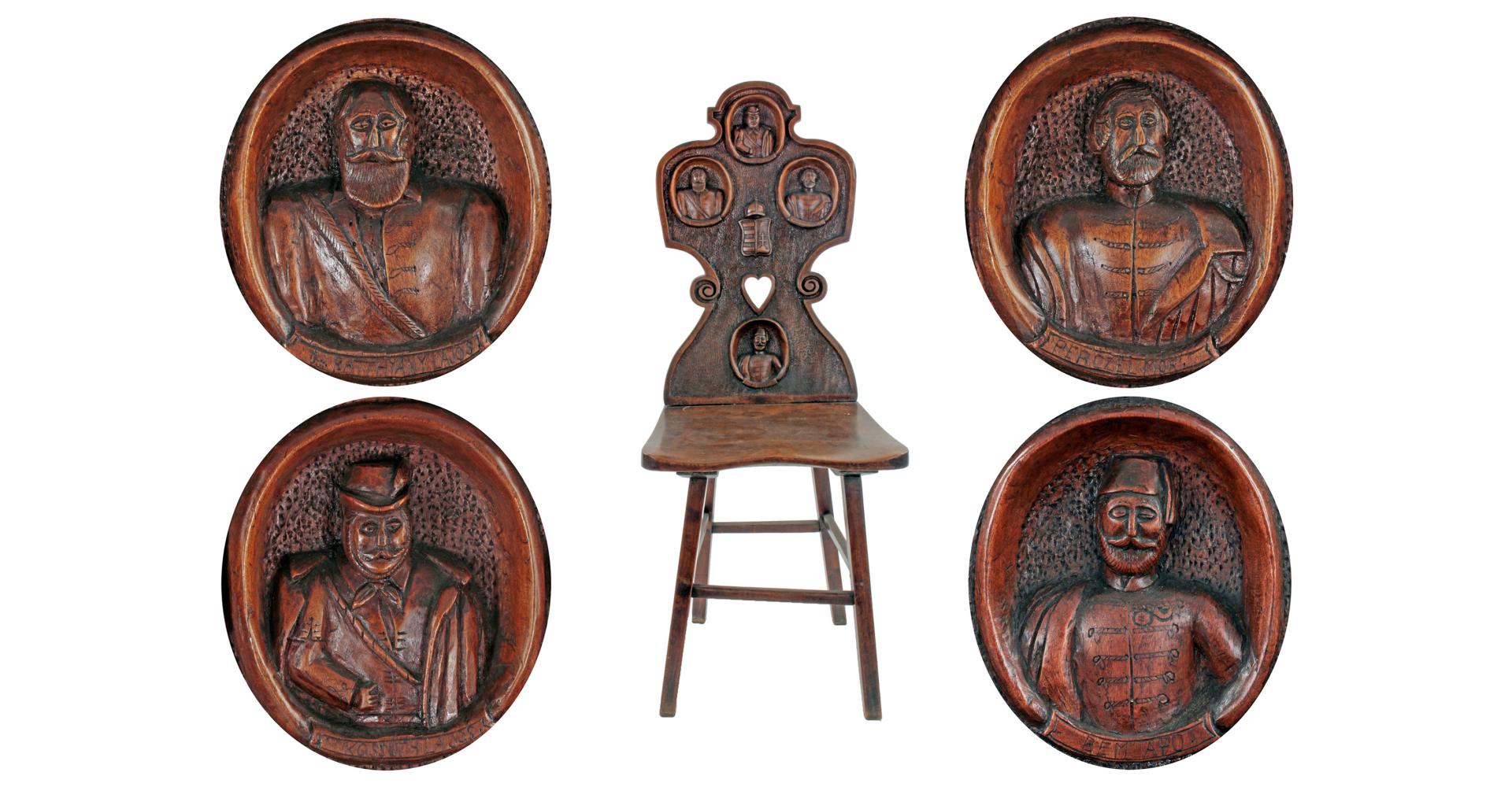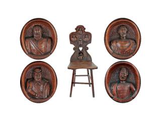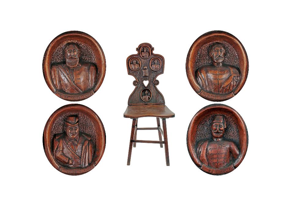 Keményfából faragott támlás szék, amelynek hátlapját pajzsszerűen alakították ki. A támla közepén koronás címer, körülötte négy történelmi személy mellképe látható: Kossuth Lajos, Batthyány Lajos, Perczel Mór és Bem József. Az ülőlap alján bekarcolt szöveg 1918. II.14 Kaposvár K. B. Szigetvár. A tárgyat a leltárkönyv régi anyagként tartja számon, a faragó személye ismeretlen. A szék aljára karcolt dátum egyértelműen jelzi, hogy a műtárgy az I. világháború idején készült, amikor a nemzeti érzések felerősödtek, aminek köszönhetően előtérbe kerültek a szabadságharc-, illetve a Kossuth-kultusz elemei is. A szabadságharc emblematikus alakjai közül a központi szerep kétségkívül Kossuth Lajosé. Emléke a néphagyományban korszakokat átívelően továbbélt. Kultusza már a szabadságharc idején kialakult, nem véletlenül, hiszen létrejöttéhez Kossuth maga is tevőlegesen hozzájárult. A szabadságharc bukását követően a dicső katonát, a nemesi kiváltságok eltörlőjét, a jobbágyfelszabadítót éltető kultusz még tovább erősödött, amikor tüntetésszámba menően divatba jött a Kossuth-szakáll és -kalap viselése. Halála és temetése újabb lökést adott a hagyománynak. A 19. század végén Kossuth szobrok sokaságának felállítását kezdeményezték, és nemegyszer a legkisebb településekre is jutott Kossuth nevét viselő utca. A kultusz erejét mi sem mutatja jobban, mint az, hogy a centenáriumi gyűjtés 1600 adatközlést talált a személyére vonatkozóan. Népdalok, mondák sokasága őrzi nevét és a tárgyalkotó művészet darabjain is megjelenik alakja. Így a most kiállított széken, de ismerünk Kossuthot ábrázoló mézeskalács ütőfát és festett tányérokat is. A nép iránta érzett szeretetének nyelvi megjelenése a Kossuth Apánk kifejezés. Tábornokát, Bem Józsefet is megkülönböztetett szeretet övezte, hiszen nevét Bem Apóként őrizte meg az emlékezet. A mellképe a szék támláján jól felismerhető, mivel a faragómester nem honvéd, hanem török katonatiszti egyenruhában ábrázolta alakját. Mint ismeretes Bem József a szabadságharc bukását követően Törökországba emigrált. Megakadályozandó Oroszországnak történő kiadatását, áttért az iszlámhitre, belépett a török hadseregbe, abban a reményben, hogy egy török-orosz háborúban Oroszország ellen harcolhat. A szabadságharc emlékezetét felelevenítő faragómester még két alakot ábrázol a szék támláján. A mártírhalált halt miniszterelnököt, Batthyány Lajost Kossuth baloldalán, jobbján pedig Perczel Mórt, az ozorai diadal bonyhádi származású tábornokát.
