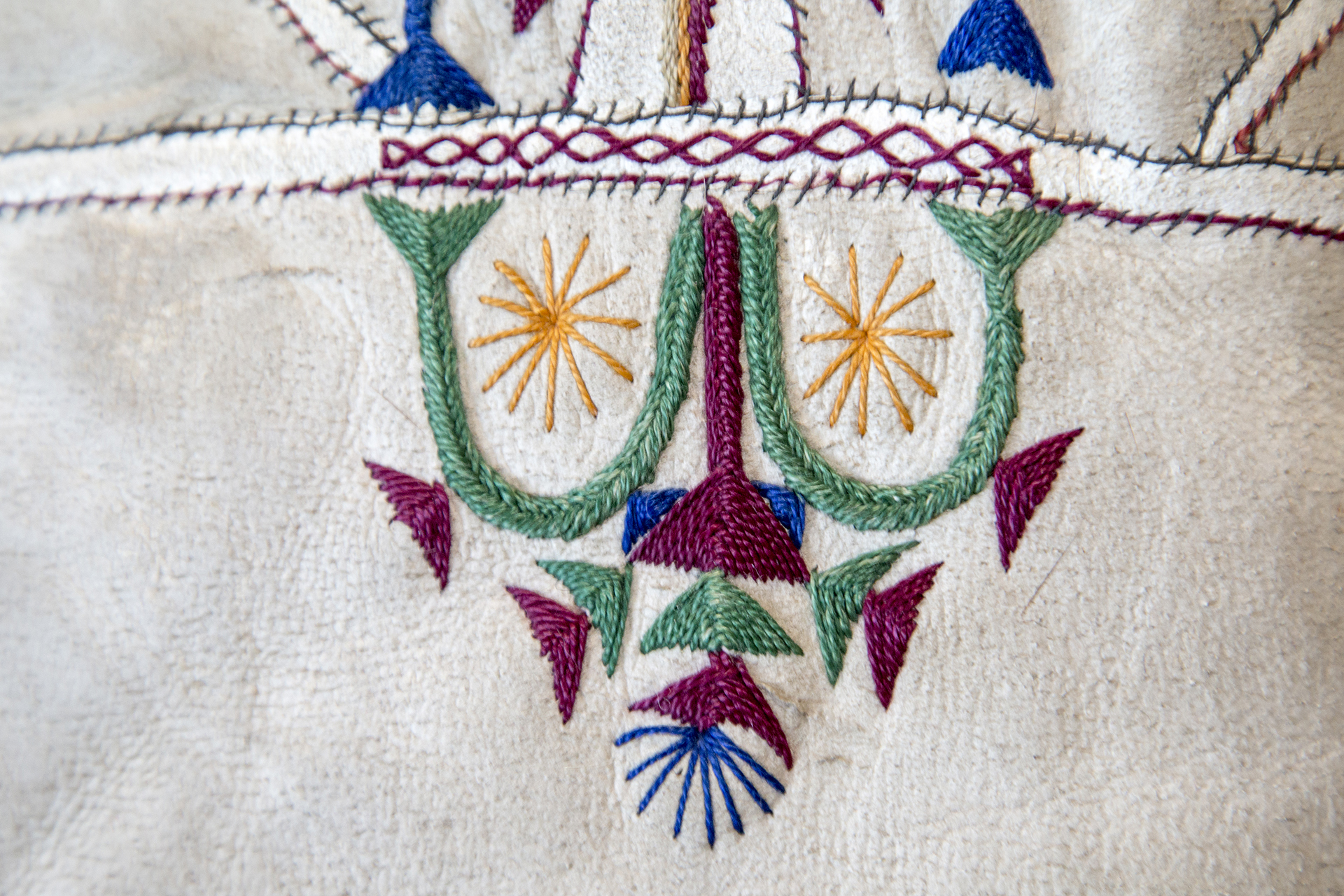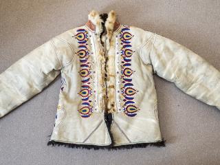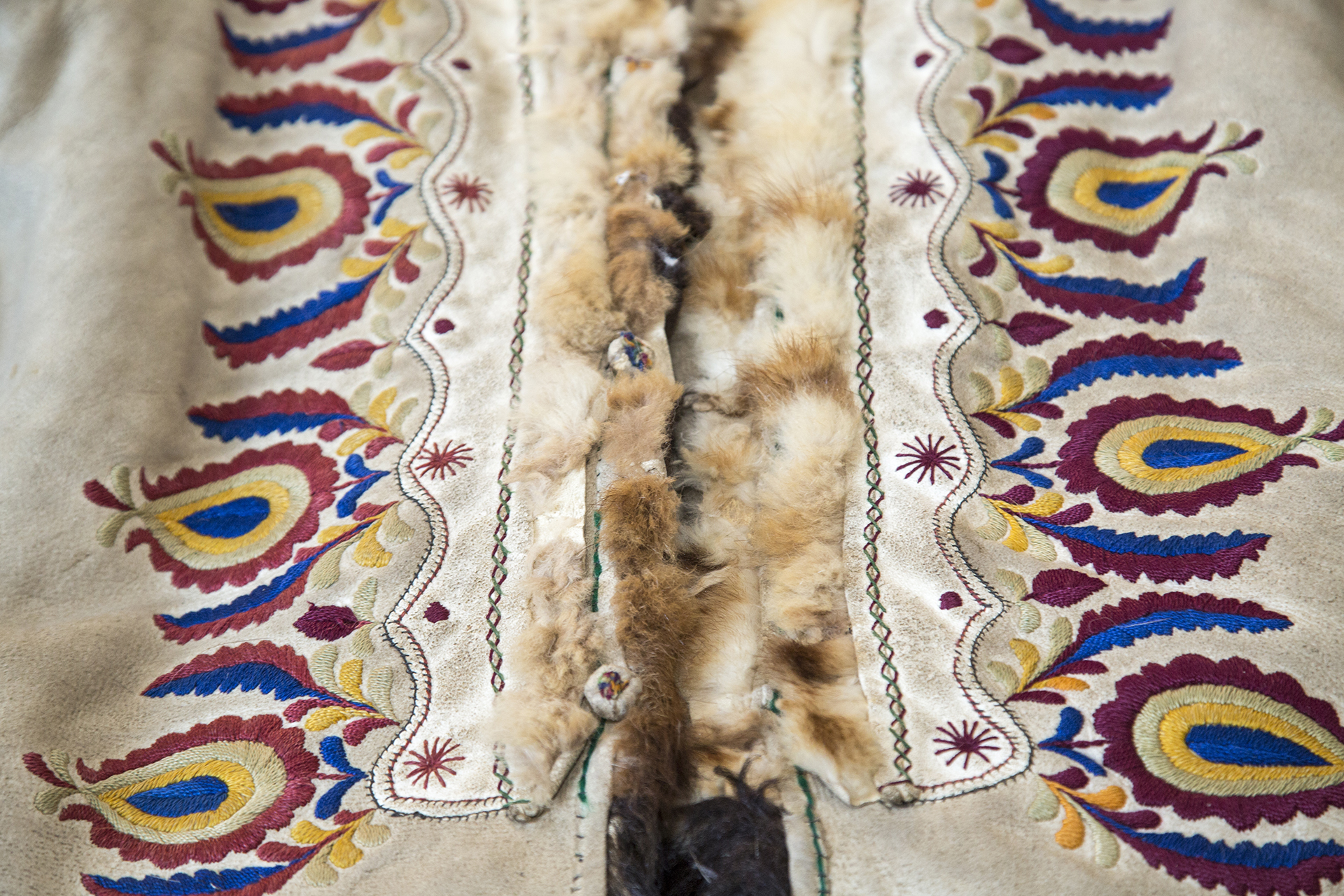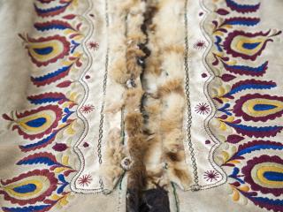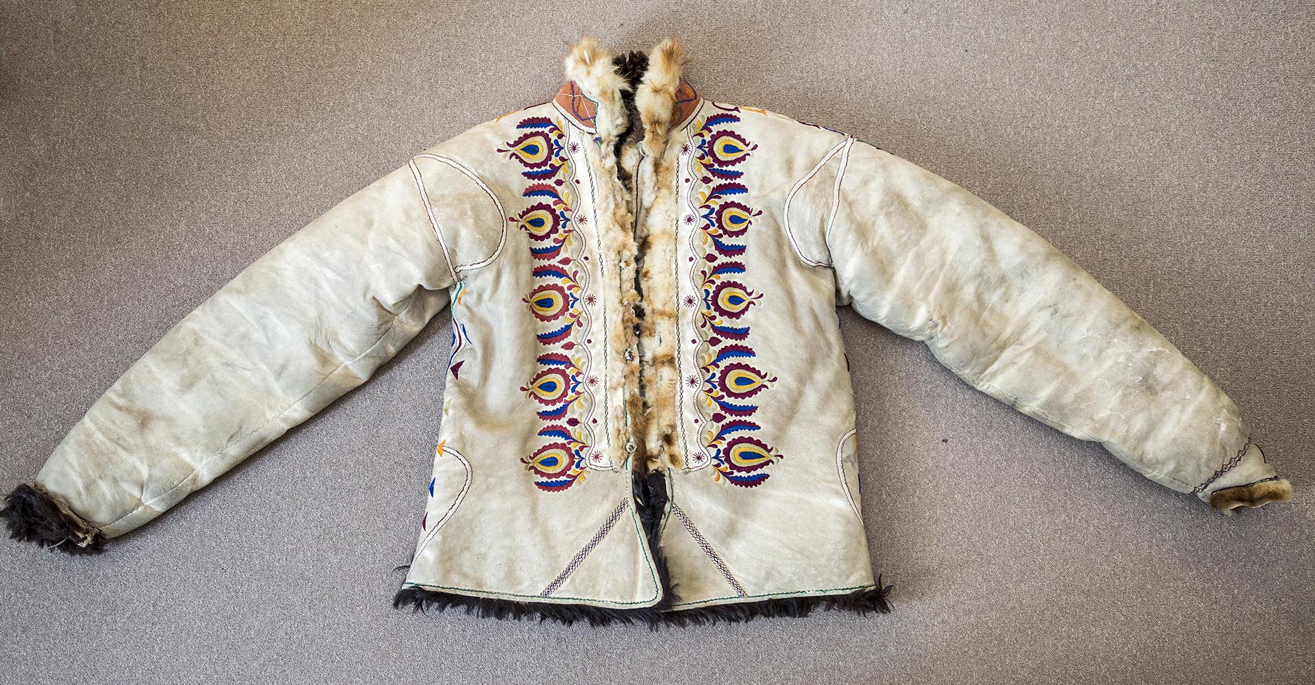 Bukovinai székely viseleti darab. Hadikfalván készült 1930 körül, Kóka István nevű szűcs készítette. A hazatelepítés után már nem nagyon viselték, mert itt nem volt divat, és kinevették őket érte. Megvásárlásáig a szobában, a sublótban tartották. Hosszú barnaszőrű birka bőréből készült, a szőrt megnyírták. Bőrrátétes, elején majdnem végig és vállán dúsan hímzett. Ujján és nyakánál finomabb prémmel (mókus?) szegve, ez kopottas. Néhány helyen hullik a szőre. A bukovinai székely népviselet kiemelkedően díszes darabja volt a bunda, úgy a férfi, mint a női viseletben.