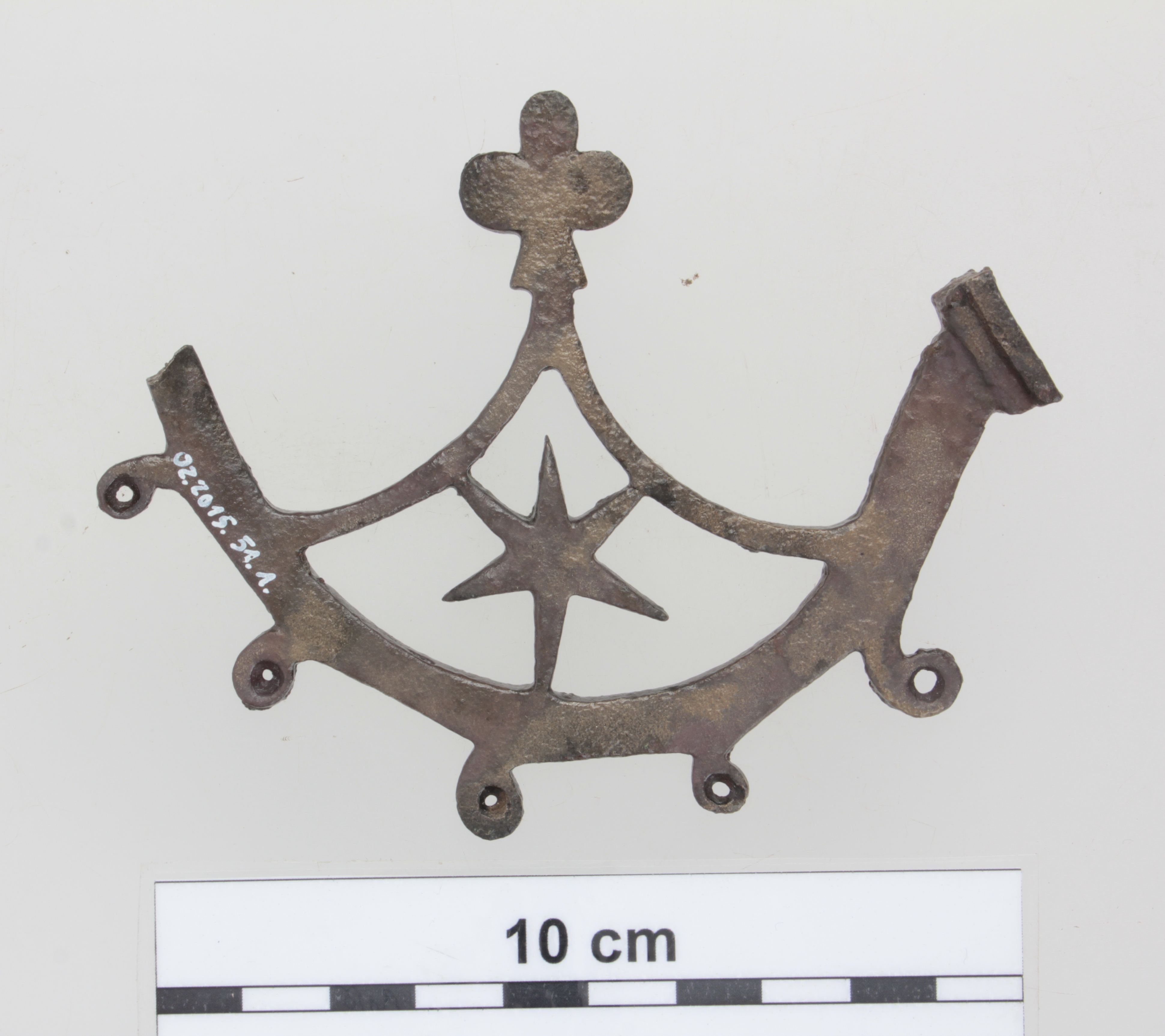 2013-ban egy újabb csillárkar töredék került elő Feld István feltárásán, a külső fal nyugati oldalánál nyitott XXIX. szelvényben. A csillárkar íves, egyik oldalán a középső dobhoz illeszkedő talpban végződik. Másik vége töredékes, a cseppfogó tányért tartó rész letörött. Az íves karhoz alul kis kacsszerű, öt áttört dísz csatlakozik. Felül az ívet két keskenyebb, csúcsban összefutó, íves pánt tölti ki, csúcsán háromkaréjos résszel. Az alsó szélesebb, és a felső két keskenyebb ív közötti részben egy csillag látható.