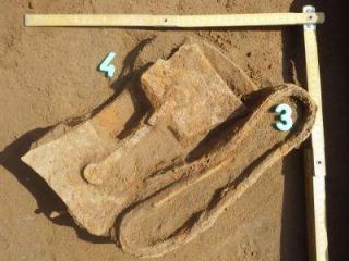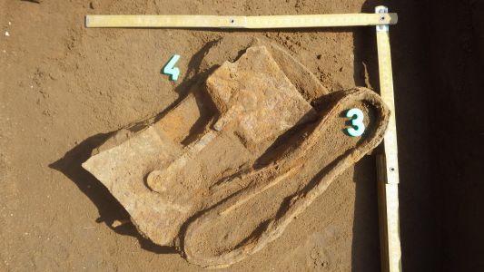 A fegyverek leírása: Szalag alakú, trapéz szárnyú, ónozott felületű vas pajzsdudor, amelyre a vékony vasszalagból készült, ovális végű pajzsfogót nagy, kerek, szintén ónozott fejű szegecsekkel erősítették. Más sírleletekből tudjuk, hogy az ilyen típusú umbo egy nagyobb méretű (100-120 x 60-80 cm-es) ovális alakú, fából, bőrből készült pajzs közepén volt, a pajzsot tartó kéznek helyet adva és védve azt. Sőt támadásra is alkalmas volt: a pajzzsal való ütéskor maga is harci eszközként funkcionált. Háromrét hajlított vaskard a hüvelyében. A viszonylag jó állapotban megmaradt kardpenge csapott vállú, középbordája enyhén kiemelkedő, hegyes végű. A penge hossza 89 cm, a legnagyobb szélessége 4,5 cm. A hüvely torkolata íves, előlapján kidomborított középborda fut, a hátlapon lévő függesztőfül felső tagja pántszerűen átfogja azt, alsó tagja elhegyesedő végű. A hüvely alján lévő „V” alakú koptató felső részén félkör alakú hüvelyszorító található. A hüvely előlapján a korra nagyon jellegzetes módon bevésett díszítés nyomai figyelhetők meg, de a korrózió miatt ez pontosan nem kivehető.