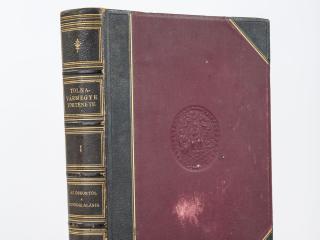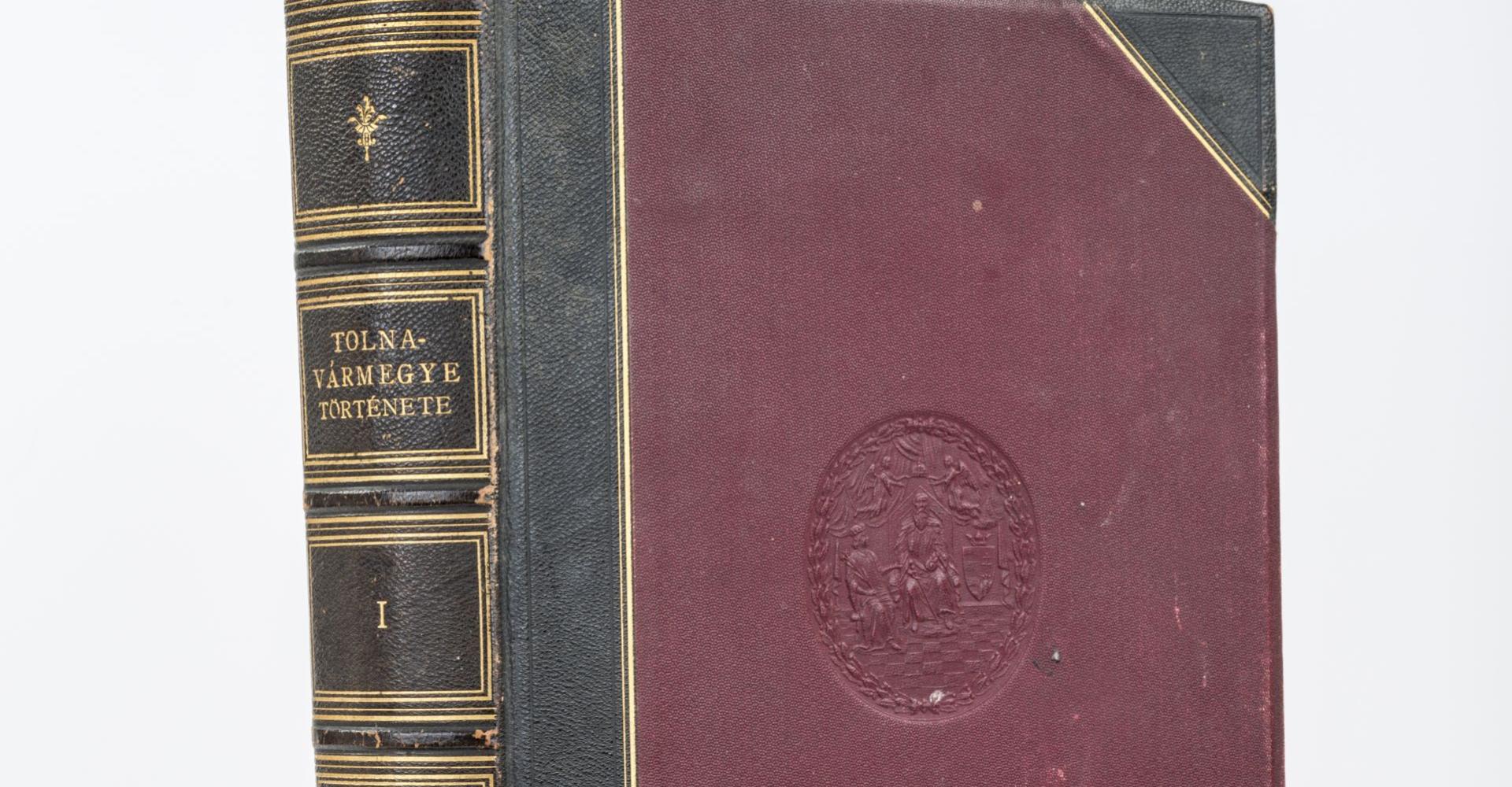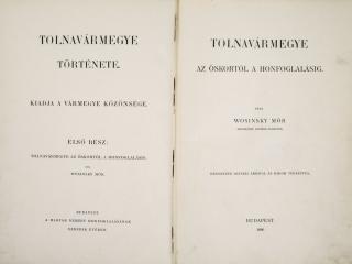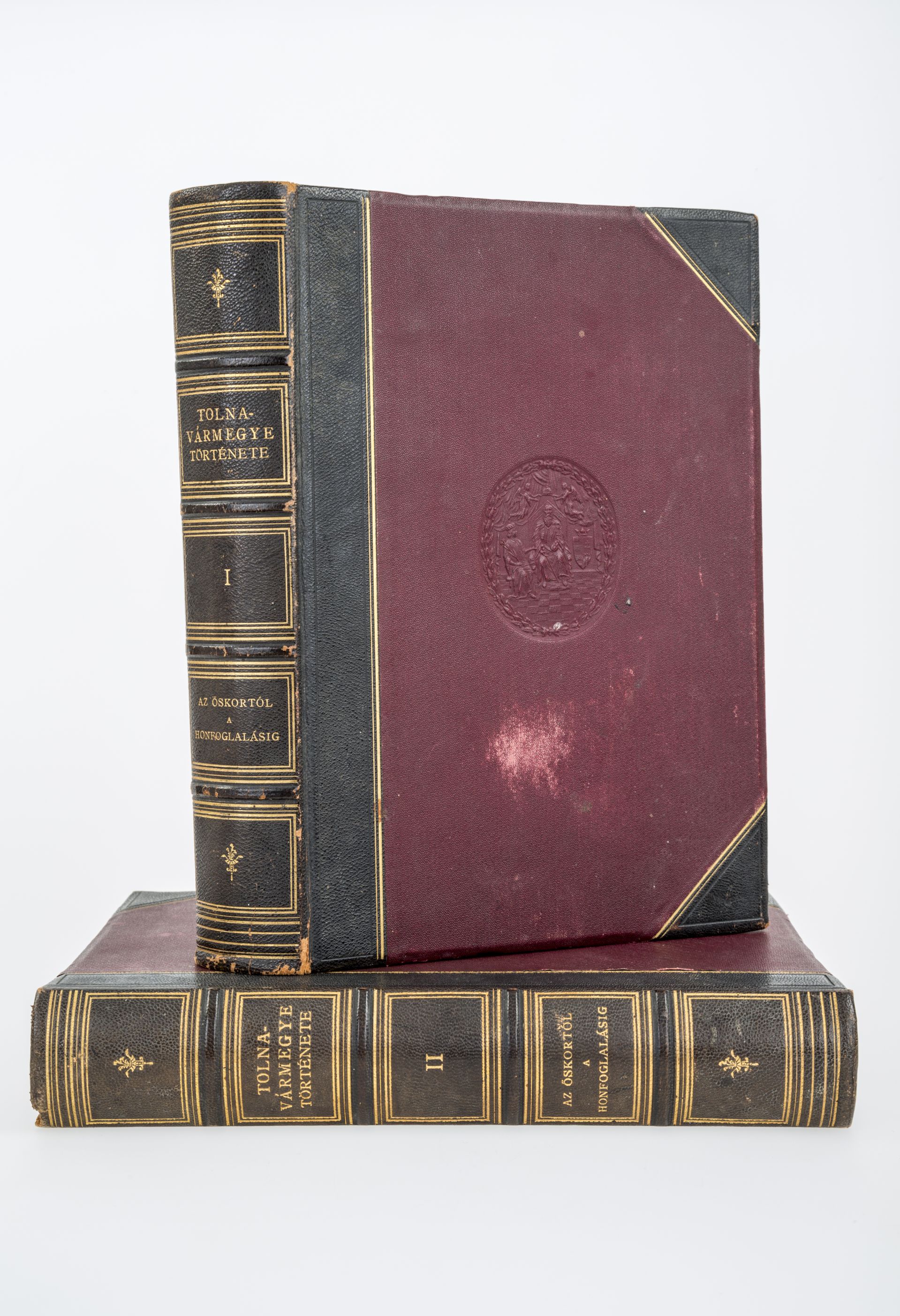 Típus: nyomtatott könyvlapok; korabeli bordázott, aranyozott gerincű félbőr kötésben; a borítón dombornyomással Tolna vármegye címere látható; foltos, sérült borító
