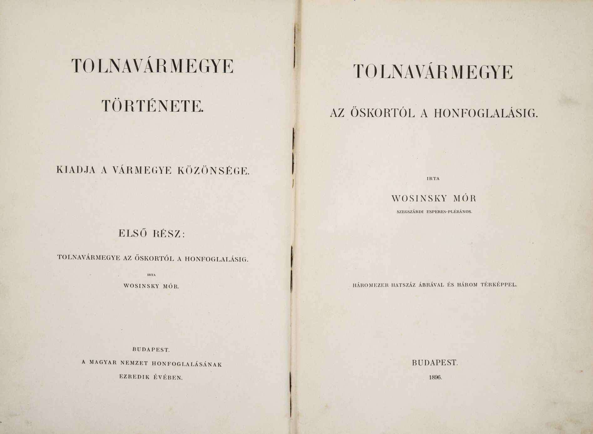 Tolna vármegye történetének megírását már 1874-ben Novák Sándor paksi orvos és régiséggyűjtő is tervezte. 88 kérdésből álló nyomatott felhívást bocsátott ki a megyei birtokosokhoz, mert egy nagy átfogó munka megírását tervezte, azonban a feladat nem sikerült, hisz annak ellenére, hogy sok anyagot gyűjthetett össze, azoknak holléte ismeretlen maradt. A régészettel foglalkozók szélesebb körben is érdeklődtek Tolna vármegye őstörténete iránt. 1882-ben megalakult a Tolnavármegyei Régészeti Egyesület, melynek célja a megyében előkerülő régészeti kincsek megmentése és a kutatások figyelemmel kísérése lett volna, de sajnos csak az alapszabályok kidolgozásáig jutottak. 1885 januárjában a törvényhatósági bizottság Péczhy József tolnai prépost indítványára elhatározta, hogy a honfoglalás ezeréves évfordulójára megíratja a megye történetét. Egy bizottság is alakult, mely Kammerer Ernőt kérte fel a monográfia megírására. A hatalmas munkára egyedül nem vállalkozhatott, ezért kérte fel az akkor Závodon plébános Wosinsky Mórt, aki addigra az őskor kutatásában már országos hírnevet szerzett, hogy a „régészeti korok” feldolgozásában segítsen.