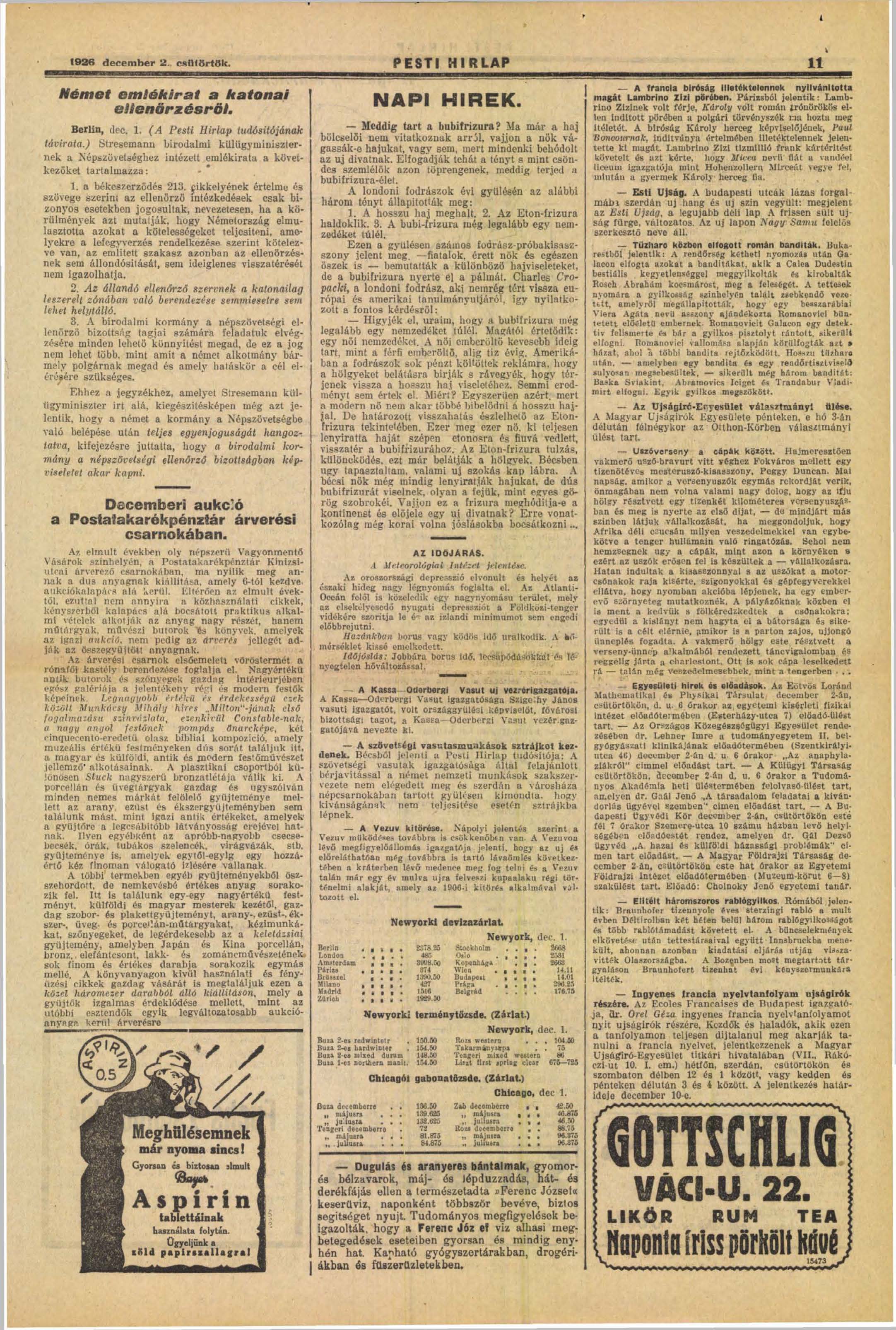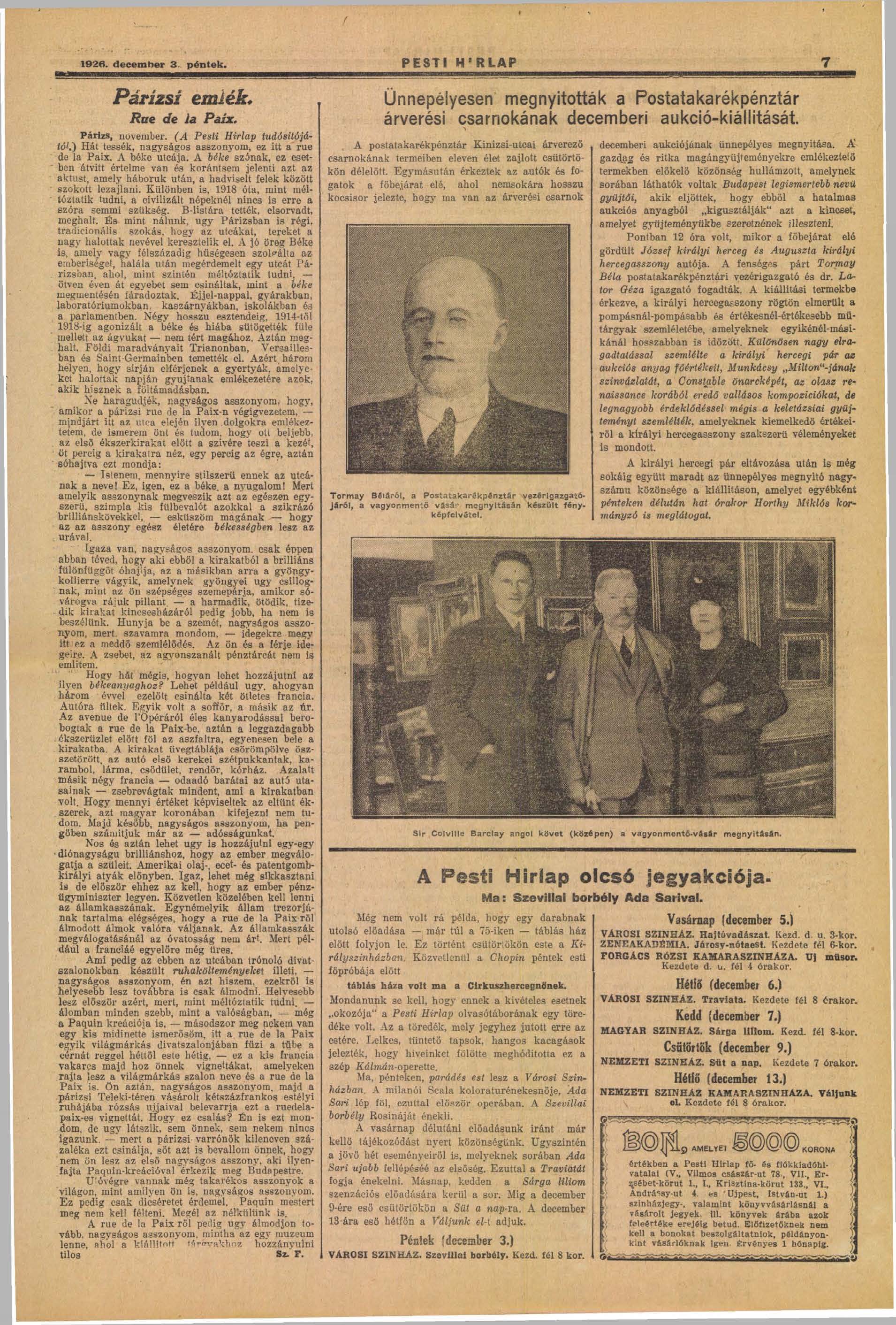 A december 6.-21. közötti árverésről, és az árverést megelőző, december 2.-5. közötti kiállításról a Pesti Hírlap 1926. december 1. szerdai számának 12. oldalán tesz említést.