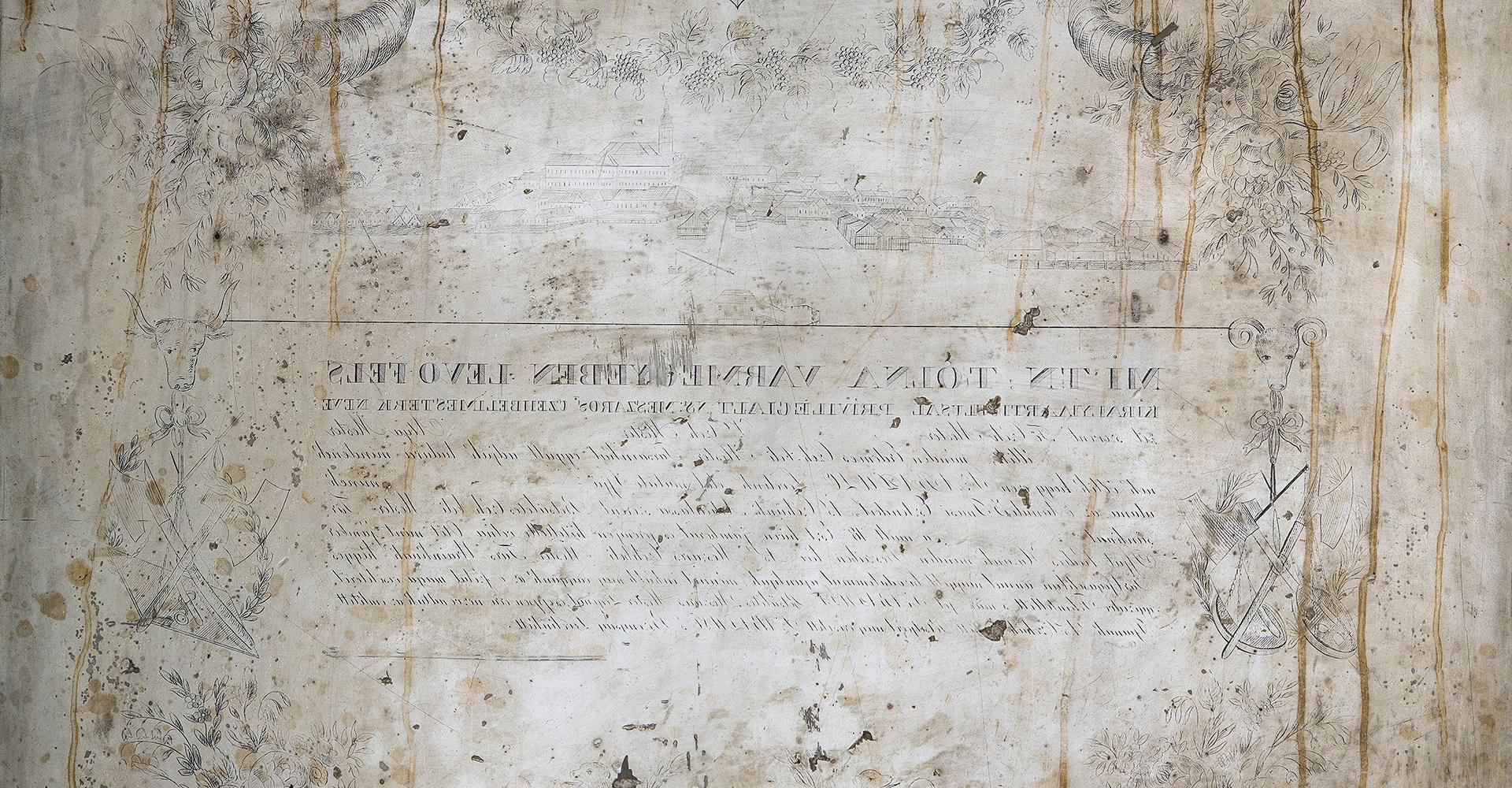 A céh az azonos szakmát folytató kézművesek érdekvédelmi szervezete volt a feudalizmus korában. Végső felszámolásukra csak 1872-ben került sor. A céhes ipartörténet korából rengeteg tárgyi emlék maradt fent, melynek egyik különleges példánya a márványból faragott litográf negatívkő (1. ábra), mellyel a szekszárdi mészáros céh mesterlevelét nyomtatták az 1830-as években.