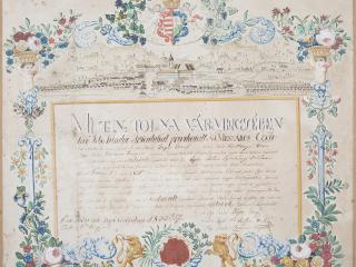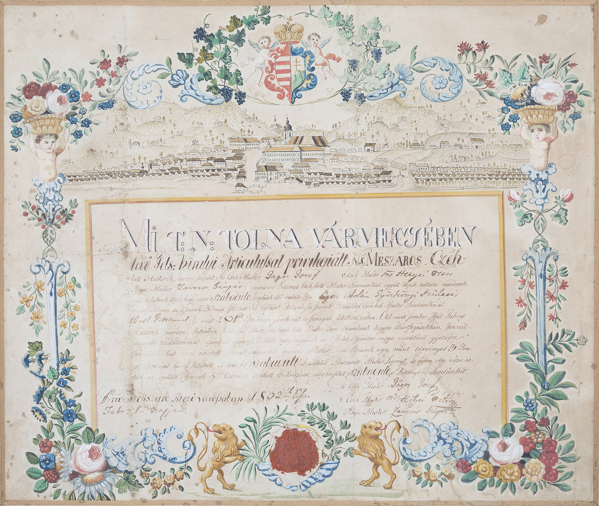 A Tolna megyei egyesült mészáros céh 1749-ben alakult meg. Erről tanúskodik a céhlevélen látható pecsét (2. ábra) is. A korábban kézzel írt mesterleveleket váltotta fel a litográf márványkővel való sokszorosítás lehetősége. A litográf eljárással történő kőnyomtatás a Münchenben élő Alois Senefelder nevéhez fűződött, aki az 1790-es évek végén találta fel és dolgozta ki az addig nem ismert új nyomtatási technológiát. A bonyolult kémiai reakciókra alapozott eljárás során – mely a víz és a zsír kölcsönös taszító tulajdonságára épült – mind a nyomó-, mind a nyomtatandó felületet kezelték, és ezáltal befolyásolták a papír festékfelvevő képességét. A litográfiai nyomtatás kezdetekor kőtáblákat, márványtáblákat használtak nyomófelületként. Igazi mestermunkának számított a márványtábla kifaragása, az aprólékos díszkeret elkészítése, illetve a tükörírással megírt szöveg kivésése, mely a nyomtatás után lett balról jobbra olvasható.