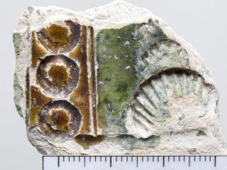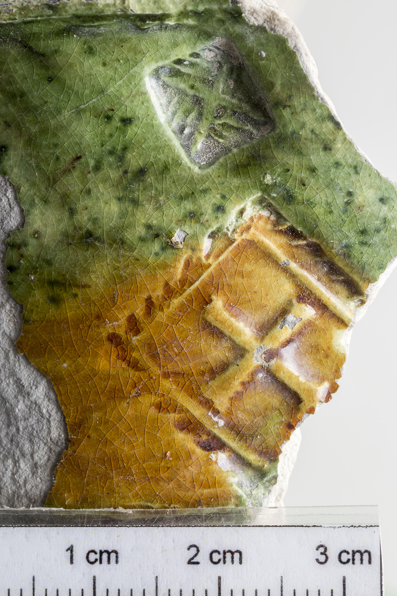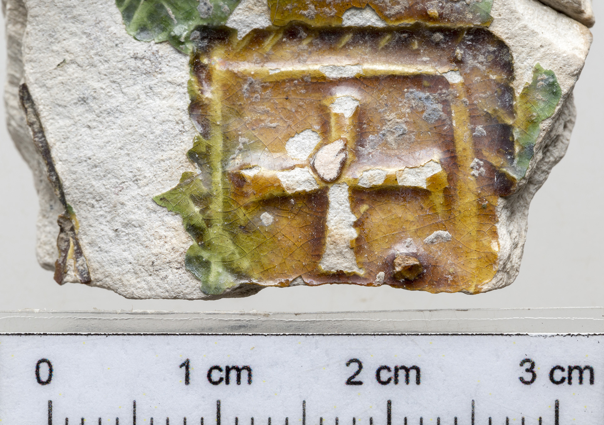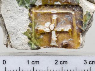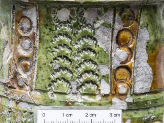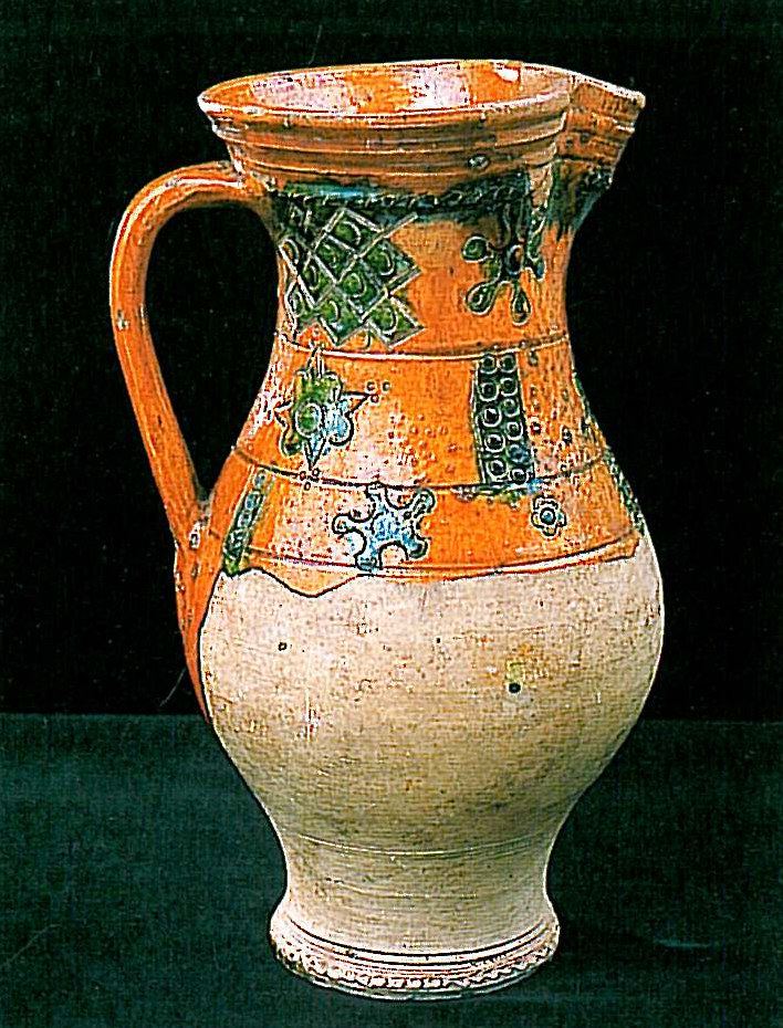 A mezőváros közepe táján feltárt gödörből kerültek elő a most bemutatandó darabok. Egy sárgásfehér anyagú, a száján, nyakán, részben a hason színes (sárgásbarna és zöld) mázzal borított felületű edényt láthatunk. A nyakon és a vállon még égetés előtt bekarcolásokkal különítettek el sávokat, amelyek közötti részt különböző színű mázzal öntöttek le. Így nem folytak össze a különböző színű mázak. A hason is bekarcolással különítették el a mázas és a mázatlan részeket. A nyakon bepecsételt koncentrikus köröket, íves ágú fa formájú mintát, valamint egy négyzetben kereszt ábrázolást láthatunk. A vállon szintén dupla bordás szélű négyzetben szarvasábrázolást láthatunk. A nyakon és a vállon is a függőleges sávokban lévő koncentrikus körök, a fa formájú minta és a négyzetben lévő bepecsételt minta szabályos sorrendben ismétlődik. A töredékek formája alapján reneszánsz díszedény, kancsó lehetett ez a tárgy.