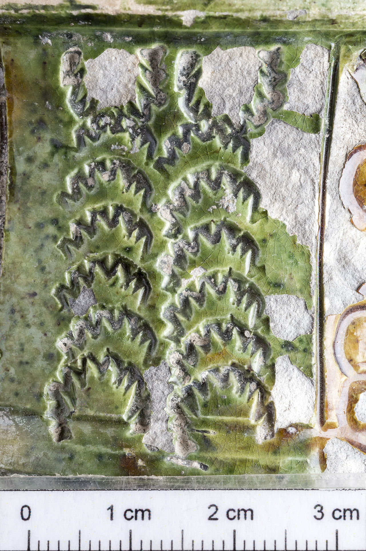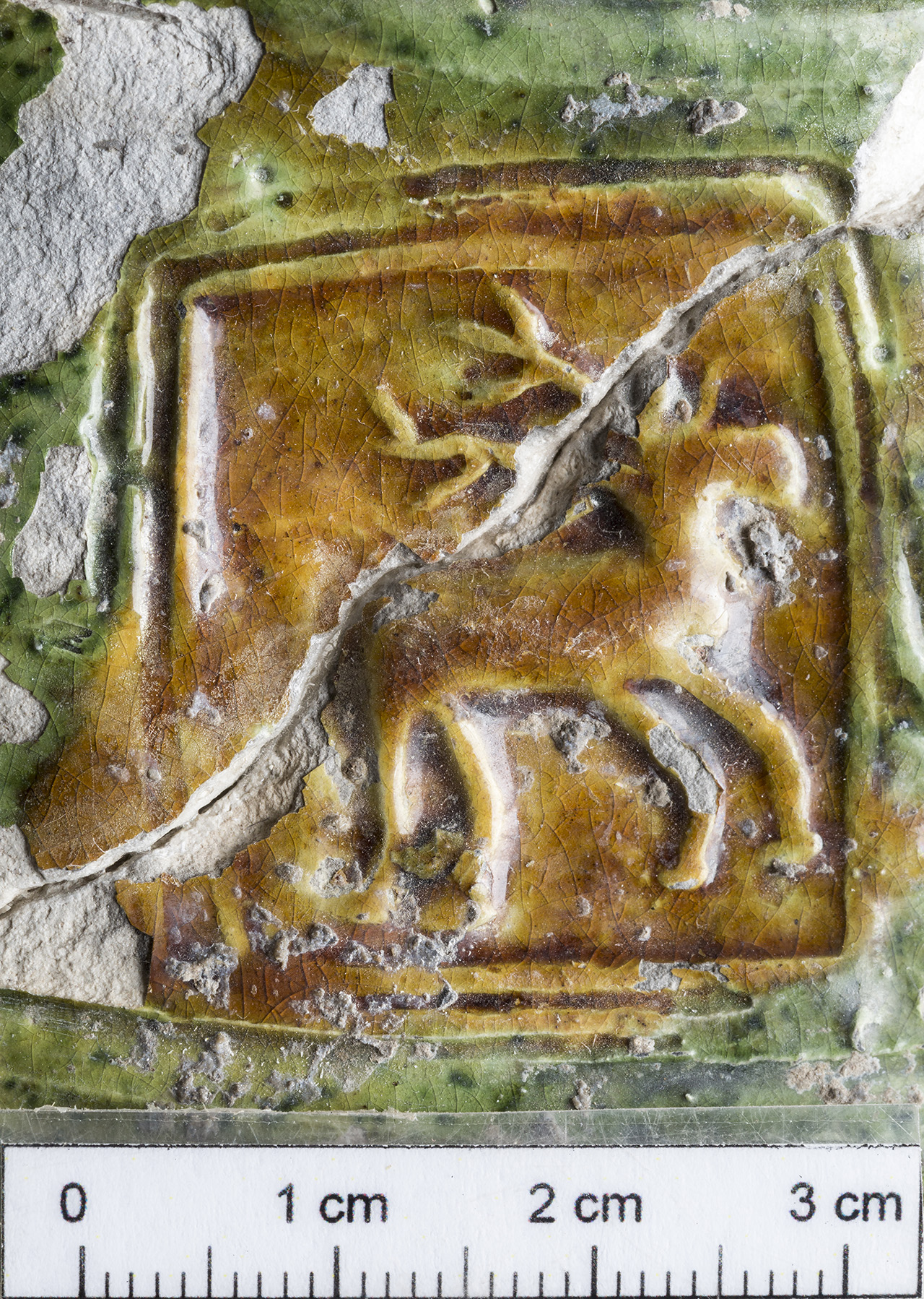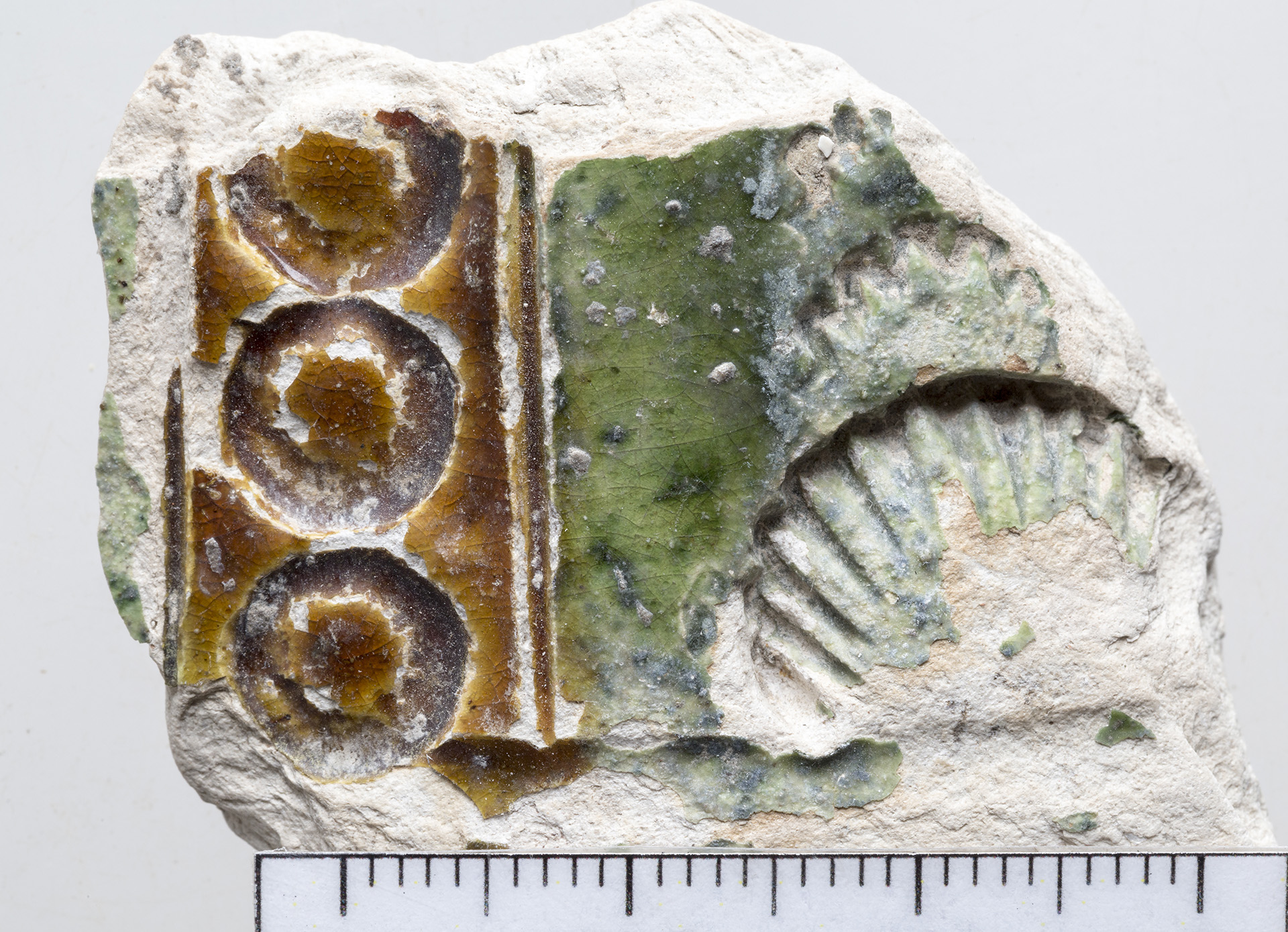 A mezőváros közepe táján feltárt gödörből kerültek elő a most bemutatandó darabok. Egy sárgásfehér anyagú, a száján, nyakán, részben a hason színes (sárgásbarna és zöld) mázzal borított felületű edényt láthatunk. A nyakon és a vállon még égetés előtt bekarcolásokkal különítettek el sávokat, amelyek közötti részt különböző színű mázzal öntöttek le. Így nem folytak össze a különböző színű mázak. A hason is bekarcolással különítették el a mázas és a mázatlan részeket. A nyakon bepecsételt koncentrikus köröket, íves ágú fa formájú mintát, valamint egy négyzetben kereszt ábrázolást láthatunk. A vállon szintén dupla bordás szélű négyzetben szarvasábrázolást láthatunk. A nyakon és a vállon is a függőleges sávokban lévő koncentrikus körök, a fa formájú minta és a négyzetben lévő bepecsételt minta szabályos sorrendben ismétlődik. A töredékek formája alapján reneszánsz díszedény, kancsó lehetett ez a tárgy.