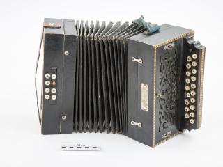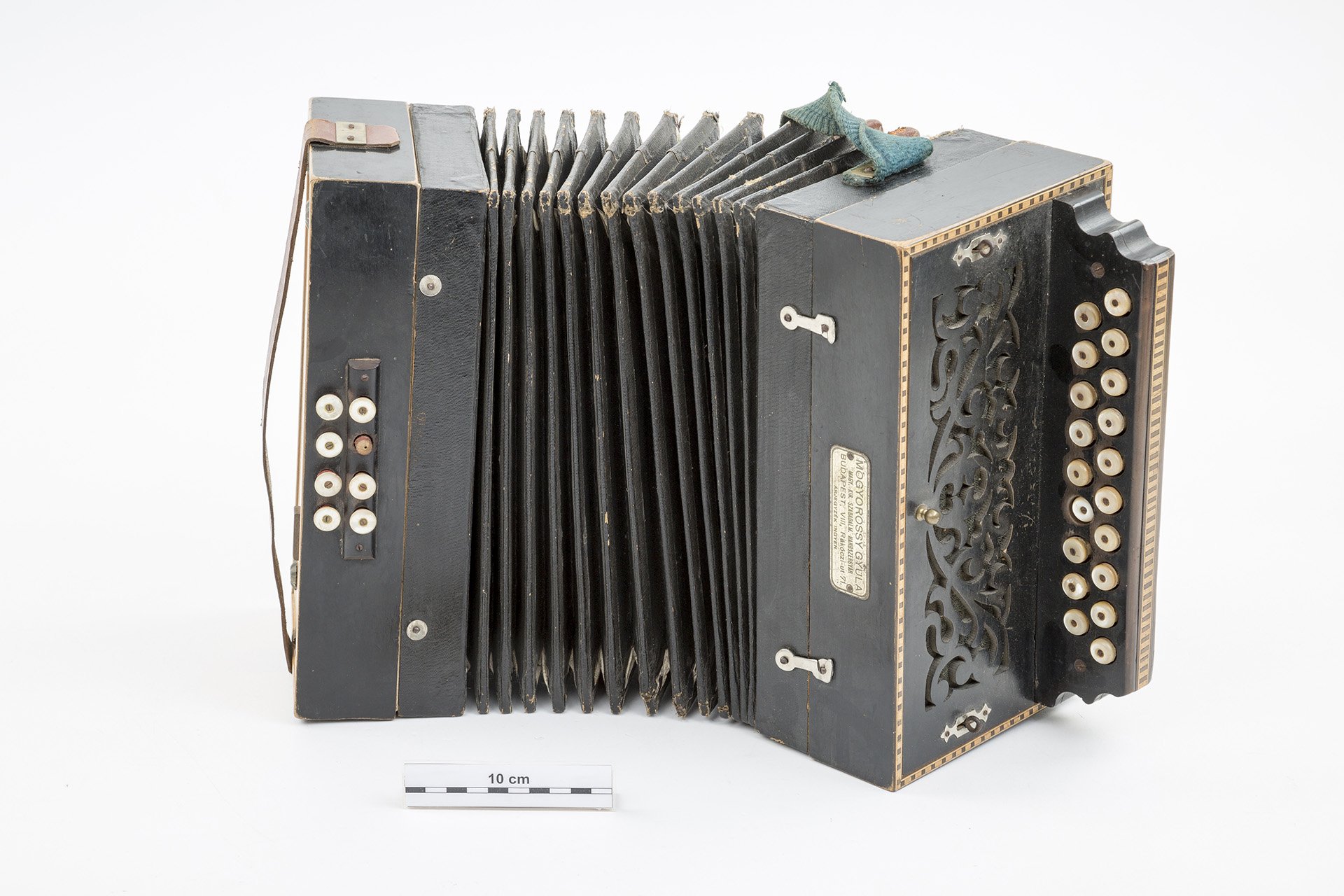 A gyűjteményünkben lévő feketére festett, vékony fenyőfából készült, jobb oldalán fűrészelt virágminta díszítésű, intarziával berakott, gyöngyház gombos hangszer, légszekrénye vékony bőrrel bevont kartonpapír. A harmonikák egyszerűbb típusához tartozik, a dallam oldalon két sorban 19 billentyű, míg a basszusoldalon nyolc billentyű alkotja a hangképzés lehetőségét, így csak néhány hangnem és alapvető akkordok lejátszására van lehetőség. A légszekrény kihúzásakor és összecsukásakor más-más hangot lehet ugyanazzal a billentyűvel megszólaltatni