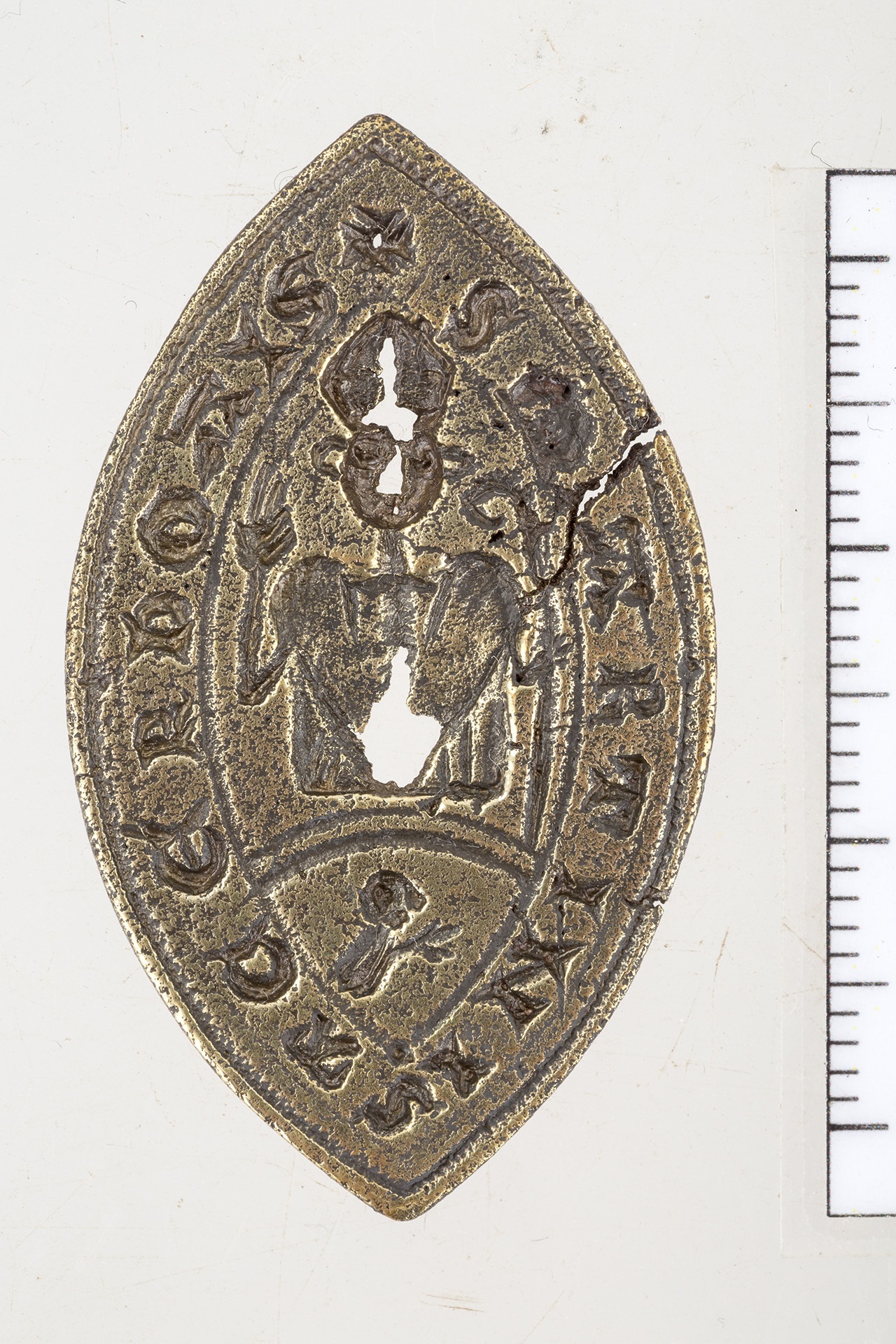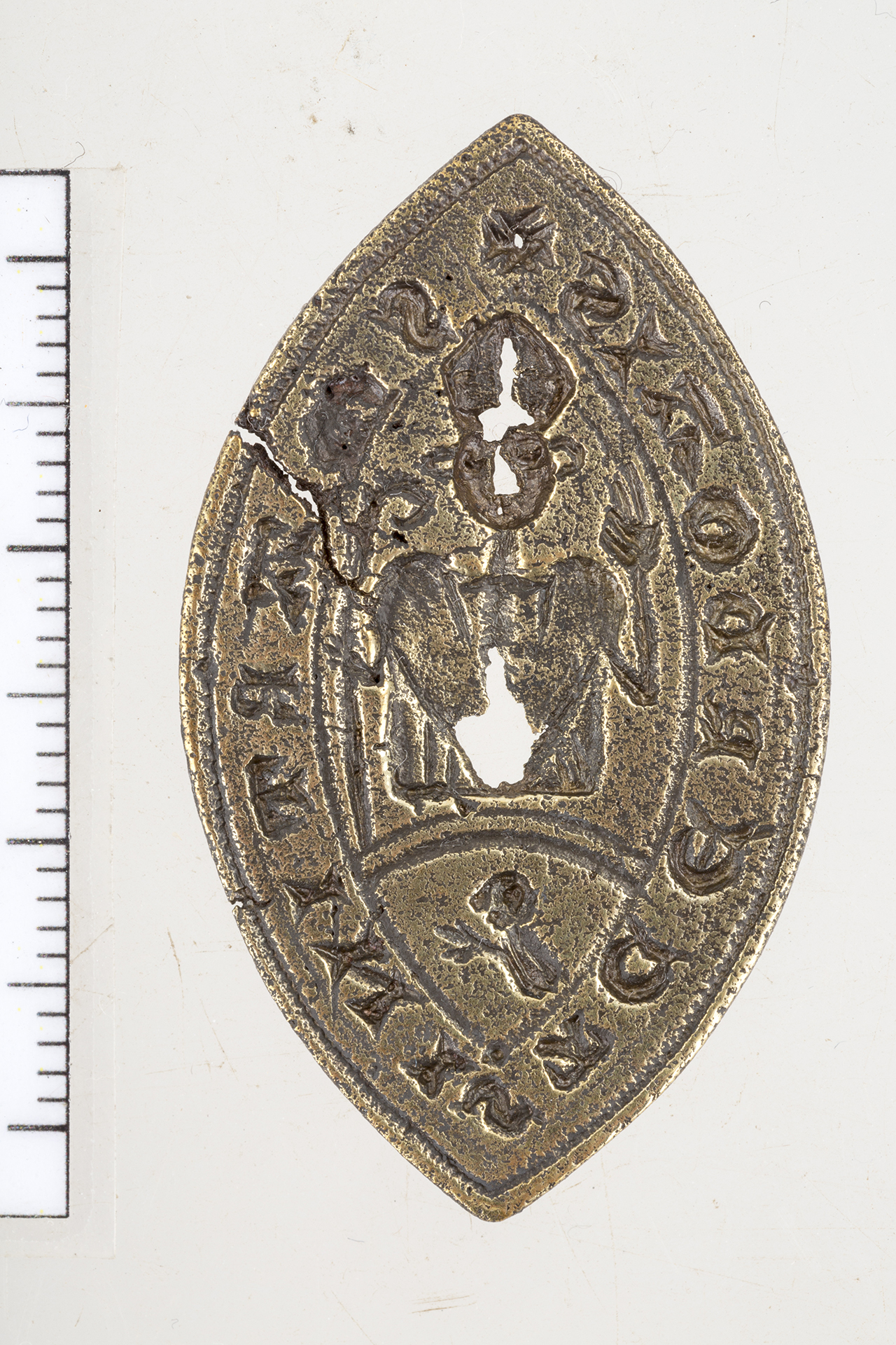 A sárgarézből készült, mandorla alakú középkori pecsétnyomó töredéke (pecsétlapja) 2016-ban került múzeumunkba, Bánó József várongi lakos ajándékaként.