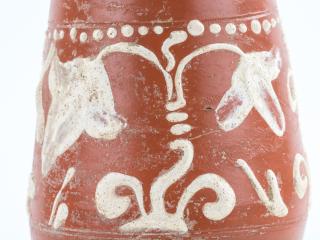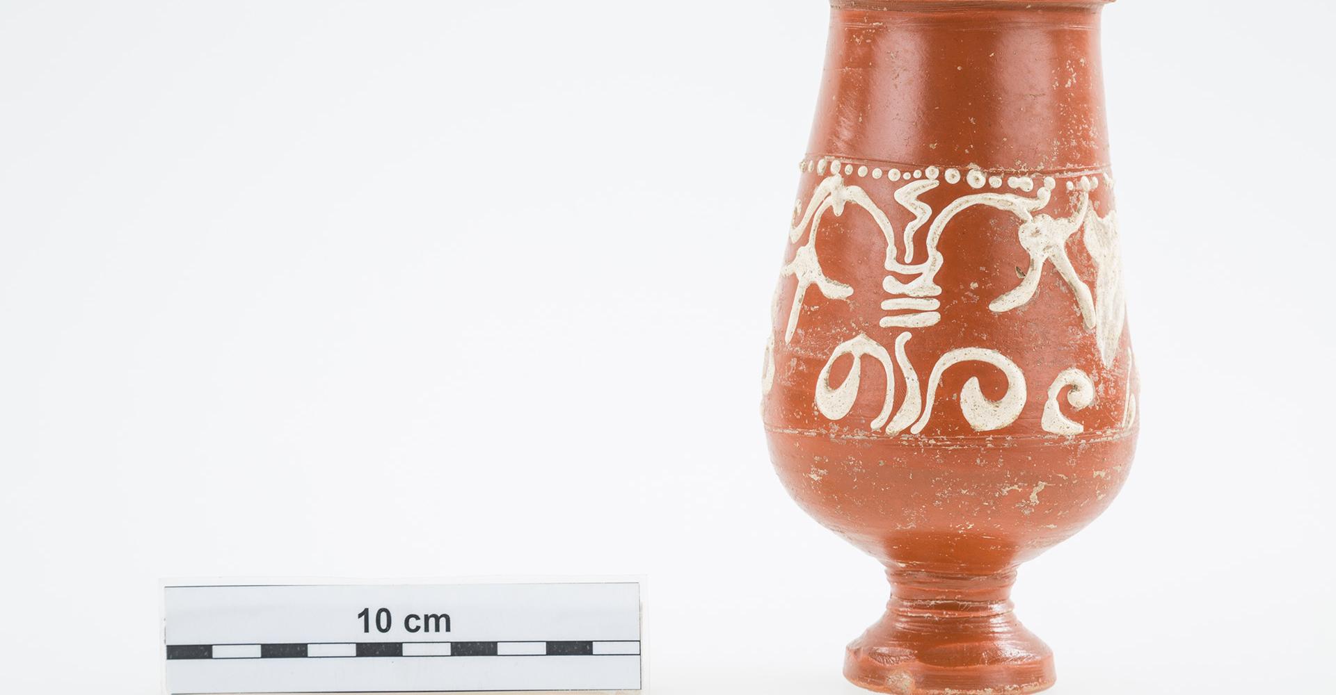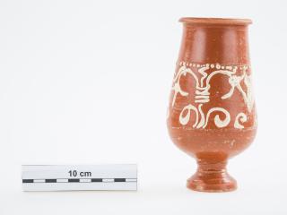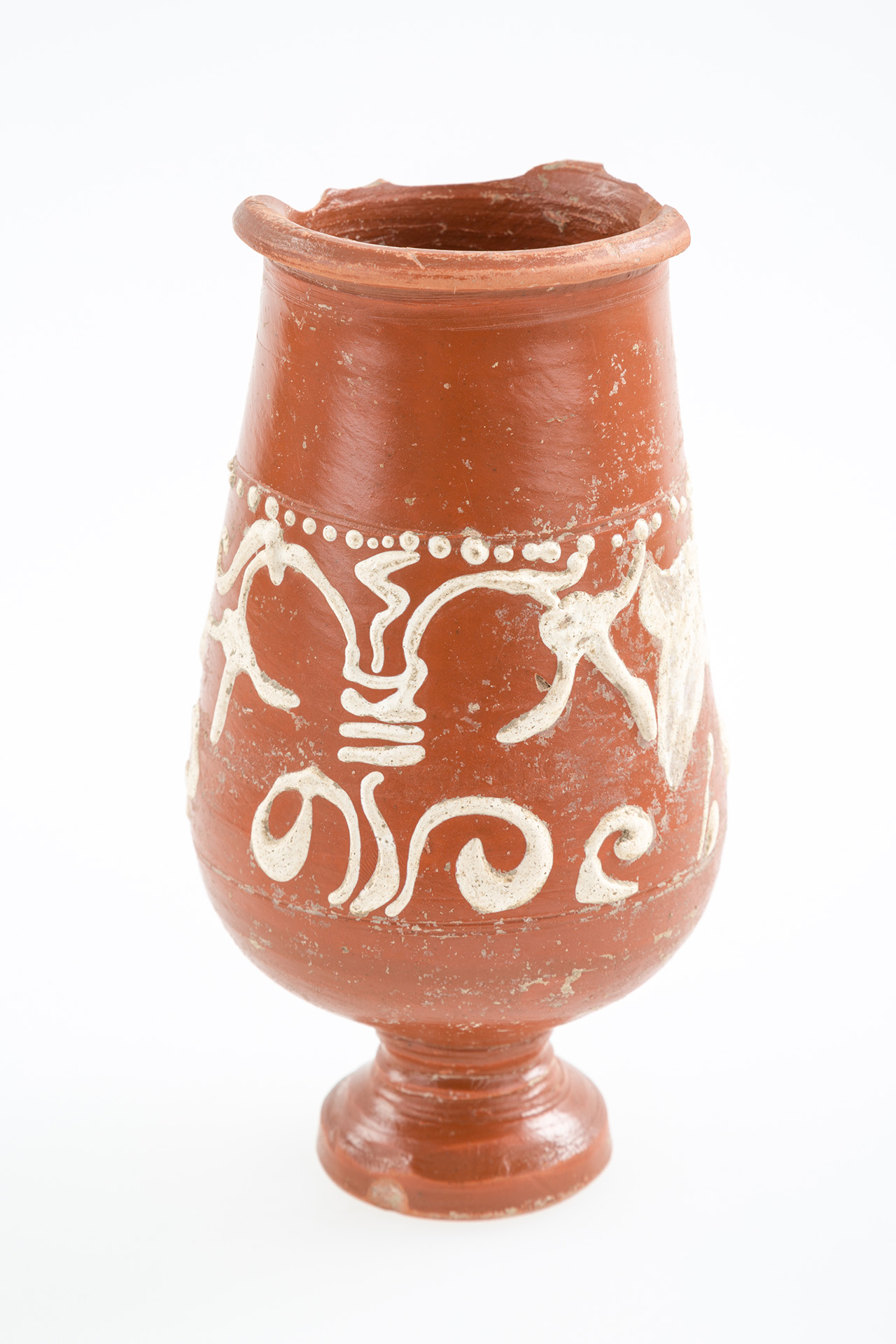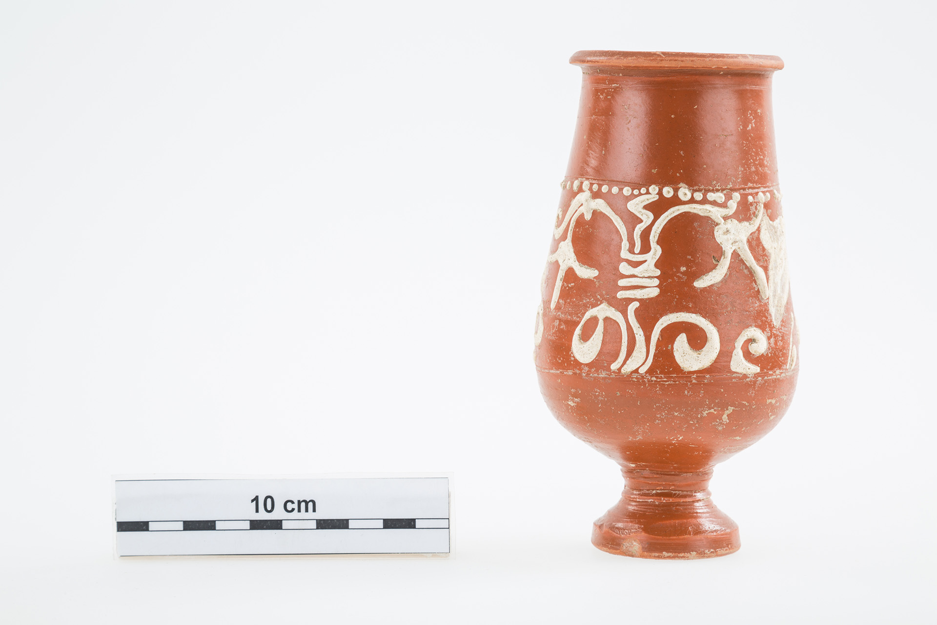 Leírás: Drag. 52 típusba tartozó, fényes, vöröses felületű talpas serleg terra sigillata, amelyet növényi motívumokat ábrázoló fehér barbotinnal díszítettek. Pereme sérült.
