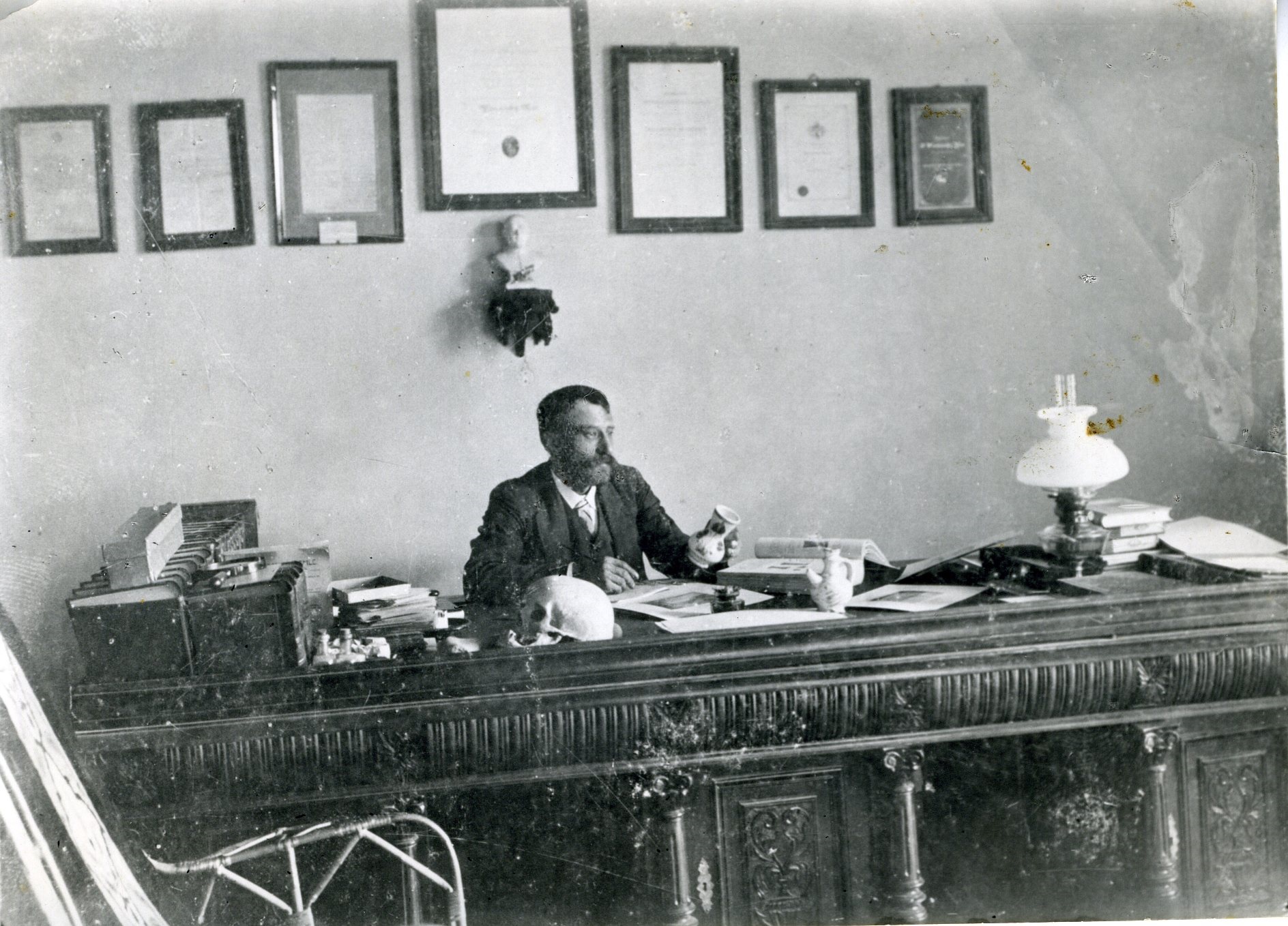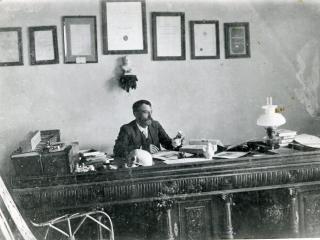 Kovách Aladár múzeumigazgató az igazgatói irodában, háta mögött a falon Wosinsky Mór gipszszobra (WMMM Újkortörténeti fotógyűjtemény, ltsz.: 1984.162.1.)