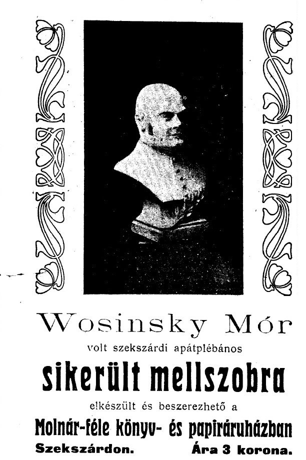 Wosinsky Mór volt szekszárdi apátplébános sikerült mellszobra elkészült és beszerezhető a Molnár-féle könyv- és papiráruházban Szekszárdon. Ára 3 korona.” – olvashatjuk. A szobor feltűnik egy szintén 1908-ban készült fotón is, amely a frissen kinevezett Kovách Aladár múzeumigazgatót ábrázolja irodájában.