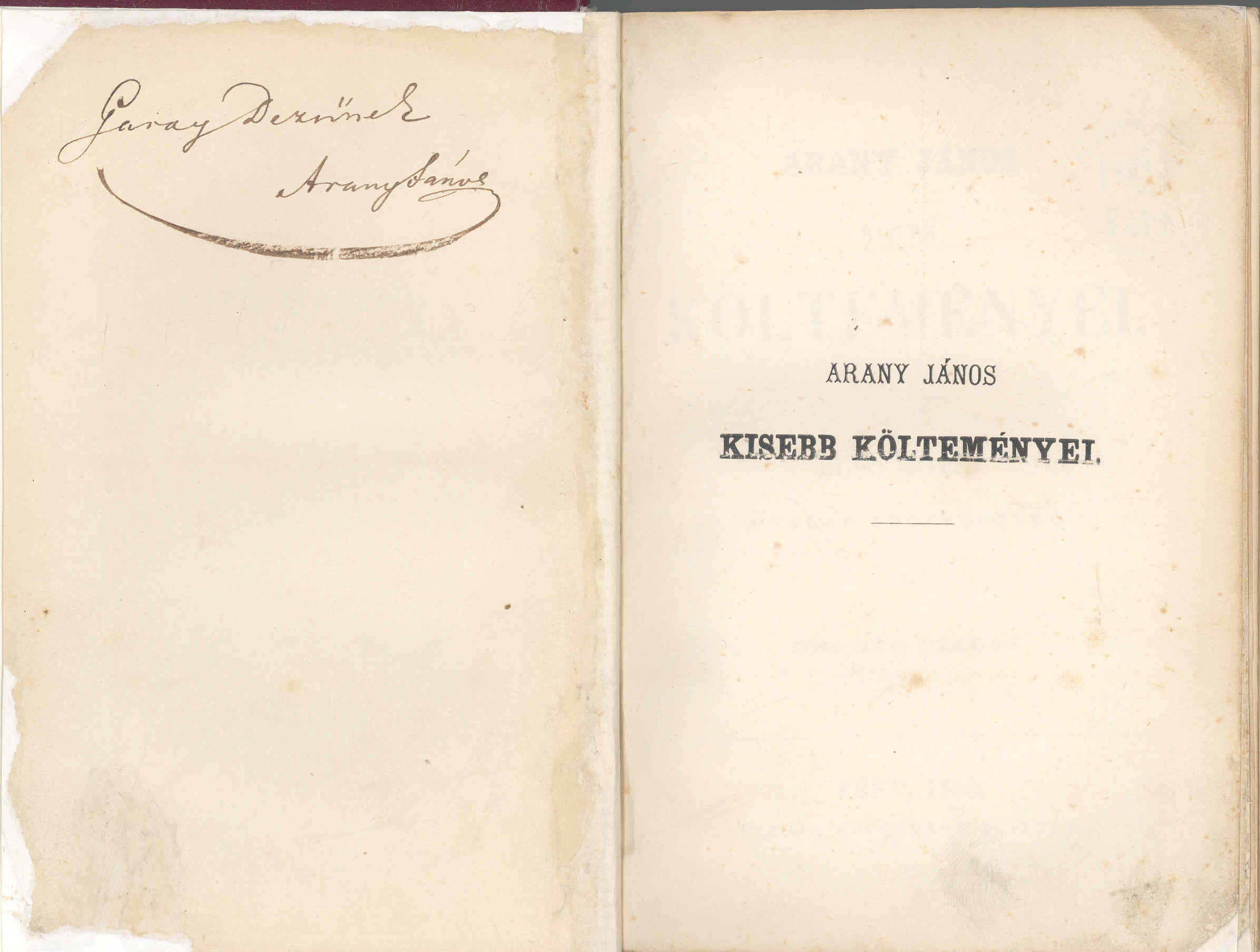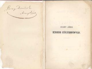 Arany János Garay Dezsőnek (1842-1904) dedikált verseskötete egy személyes találkozás emléke lehet. A dedikáció keletkezésének időpontját nem ismerjük, azonban Arany 1860 őszén költözött Pestre, azután hogy a Kisfaludy Társaság igazgatójává választotta. Ebben az évben jelent meg Kisebb költeményeinek második kiadása, Garay Dezső ekkor volt 18 éves, talán ekkor kapta születésnapi[vii] ajándékként e szép, eredetileg díszes borítójú kötetet apja egykori költő barátjának aláírásával.
