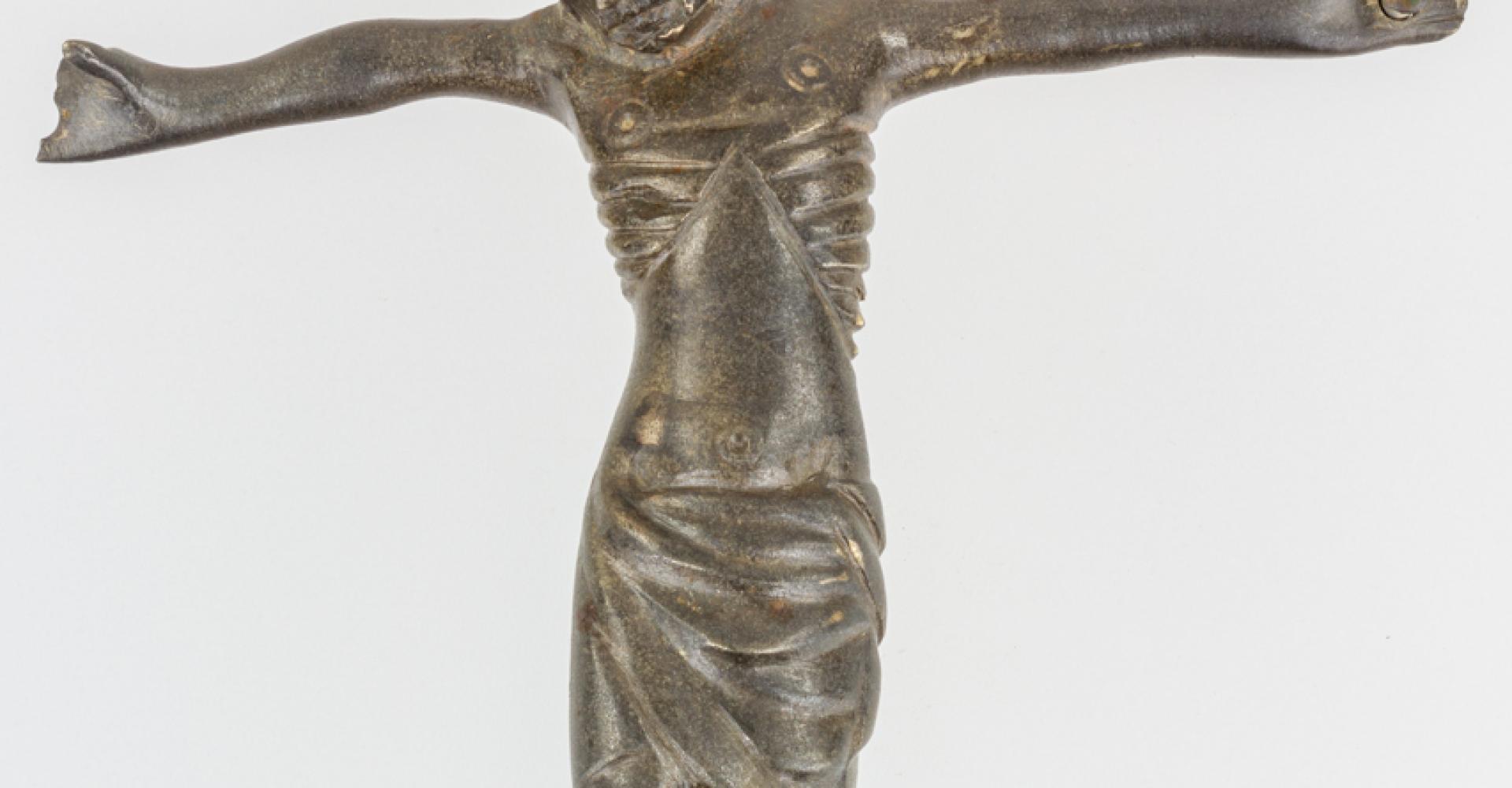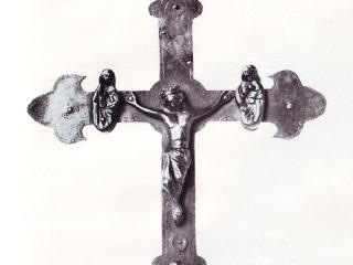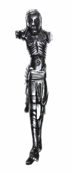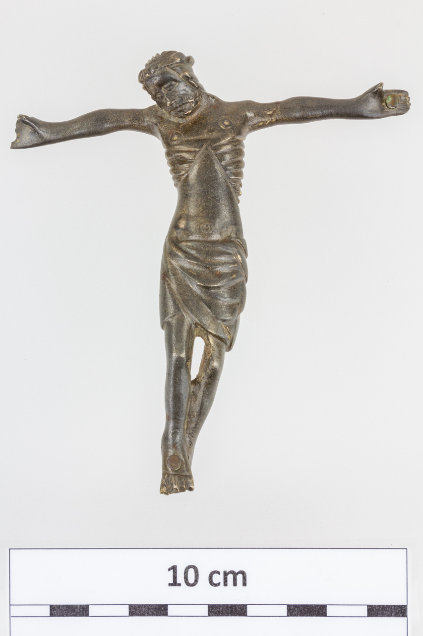 Leírás: a keresztre szegezett, halott Krisztus feje kissé megdöntve jobbra hajlik, szemei csukva, hosszú tincsekből álló haja a fejtetőn kettéválasztva, a halántékon a fület is teljesen eltakarja. A homlokon ferde rovátkákkal jelzett fonott töviskoszorú. A bajuszt sűrűn bevésett függőleges és ferde vonalak jelzik, a szakállt néhány ritkábban bevésett vonal. A karok vízszintesen nyújtva, könyékben alig behajlítva. A nyitott bal tenyér közepén 0,7 cm hosszú, 0,2 cm széles szegecs, a hüvelykujj előre áll. A jobb tenyeret ugyanígy ábrázolták, de a szegecslyuknál a tenyér letörött, az ujjak hiányoznak. A felsőtest enyhén jobbra dől, a test kissé megcsavarodik. A mellbimbókat és a köldököt pontkör jeleníti meg. A mellbimbók között hosszú, vízszintes mélyedés jelképezi a felső bordákat, a bal oldalon hét, a jobb oldalon pedig öt, egyre rövidülő mélyedés a többit. A bal oldalra aláhulló ágyékkötőt középen széles, vízszintes redőkkel ábrázolták, a jobb térd felett és a derék bal oldalán ellenben ferde sávokkal. A jobb lábfej a balra helyezve. A lábfejeket egy felül elkalapált, 1,6 cm hosszú, 0,2 cm széles szögecs fogja össze, vége 0,3 cm hosszan nyúlik túl a bal talpon. A lábujjakat apró bevágások jelzik. A fej és a végtagok tömörek, a törzs belül üreges. A szögecsek hossza alapján a korpuszt egy kb. 0,2 cm vastag lemezkereszthez erősítették hozzá.