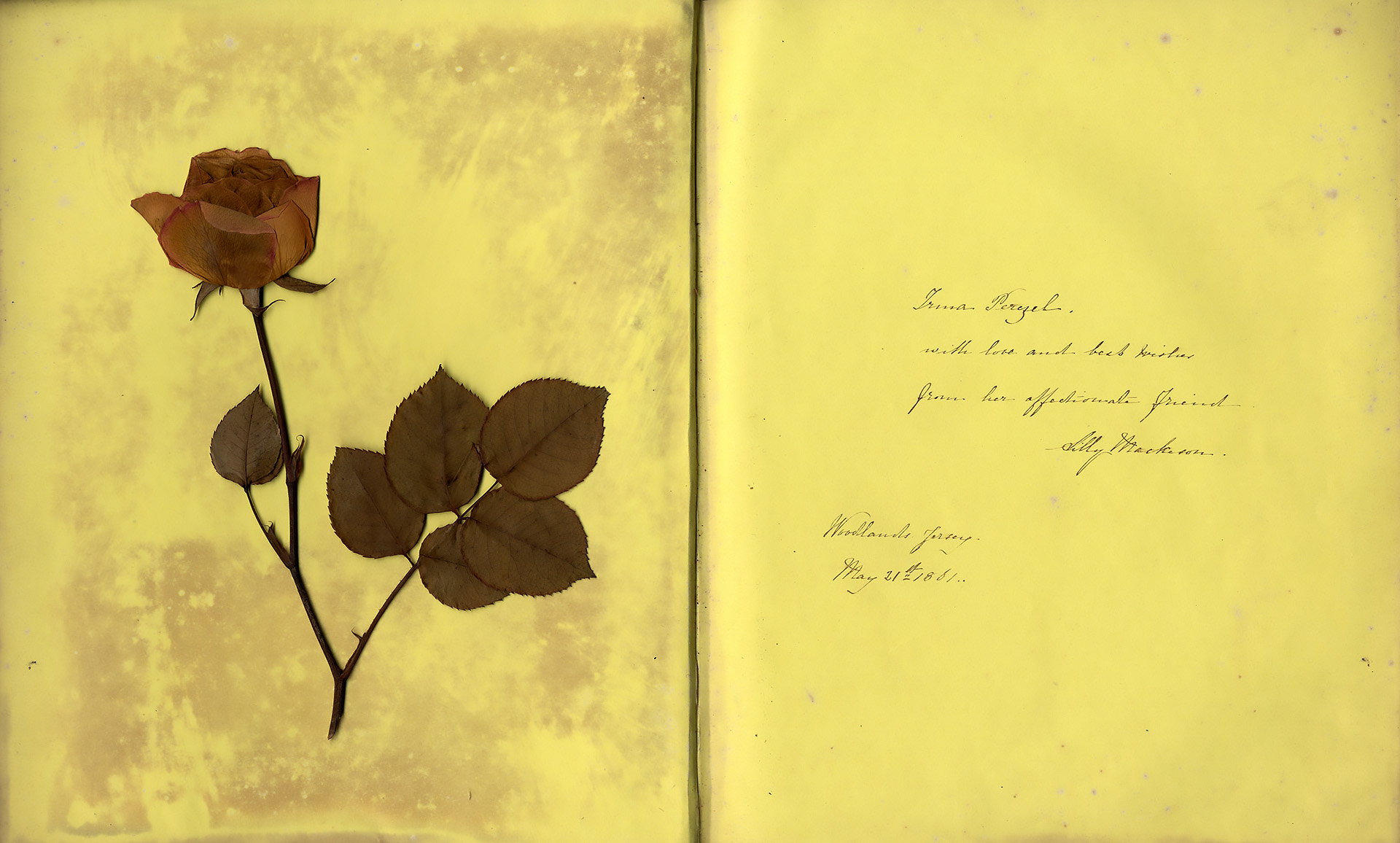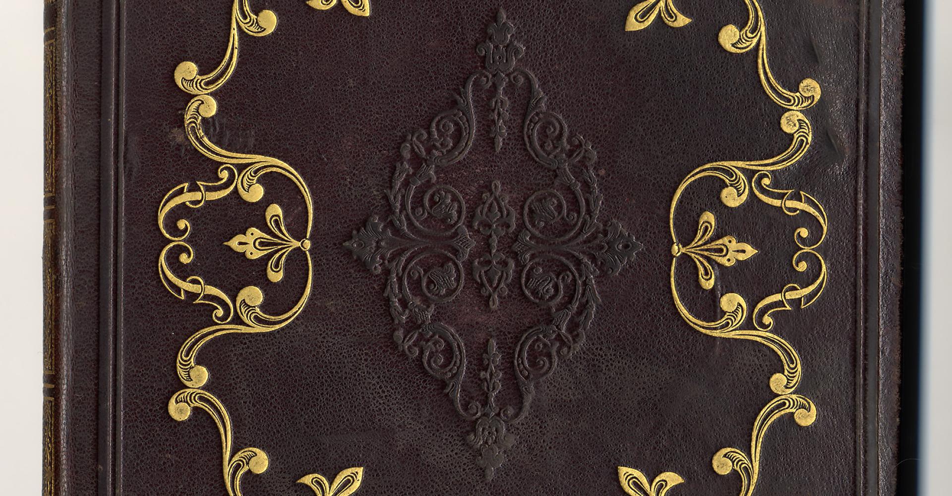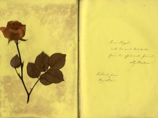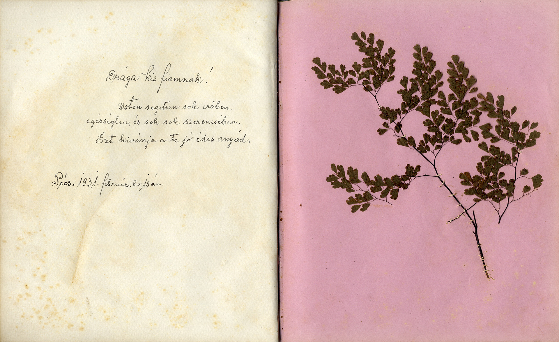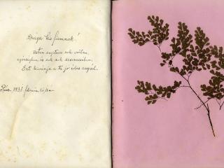 „Album” felirat olvasható, a lapszélek is aranyozottak. A lapok között néhány szárított virág, illetve levél található. Az első oldalon levő bejegyzés –