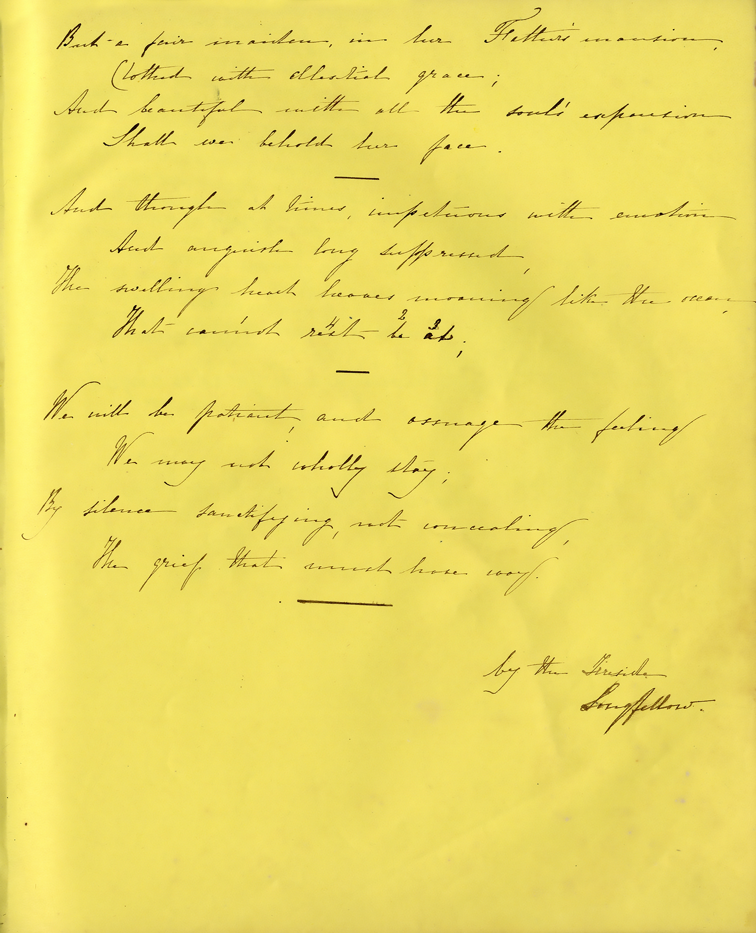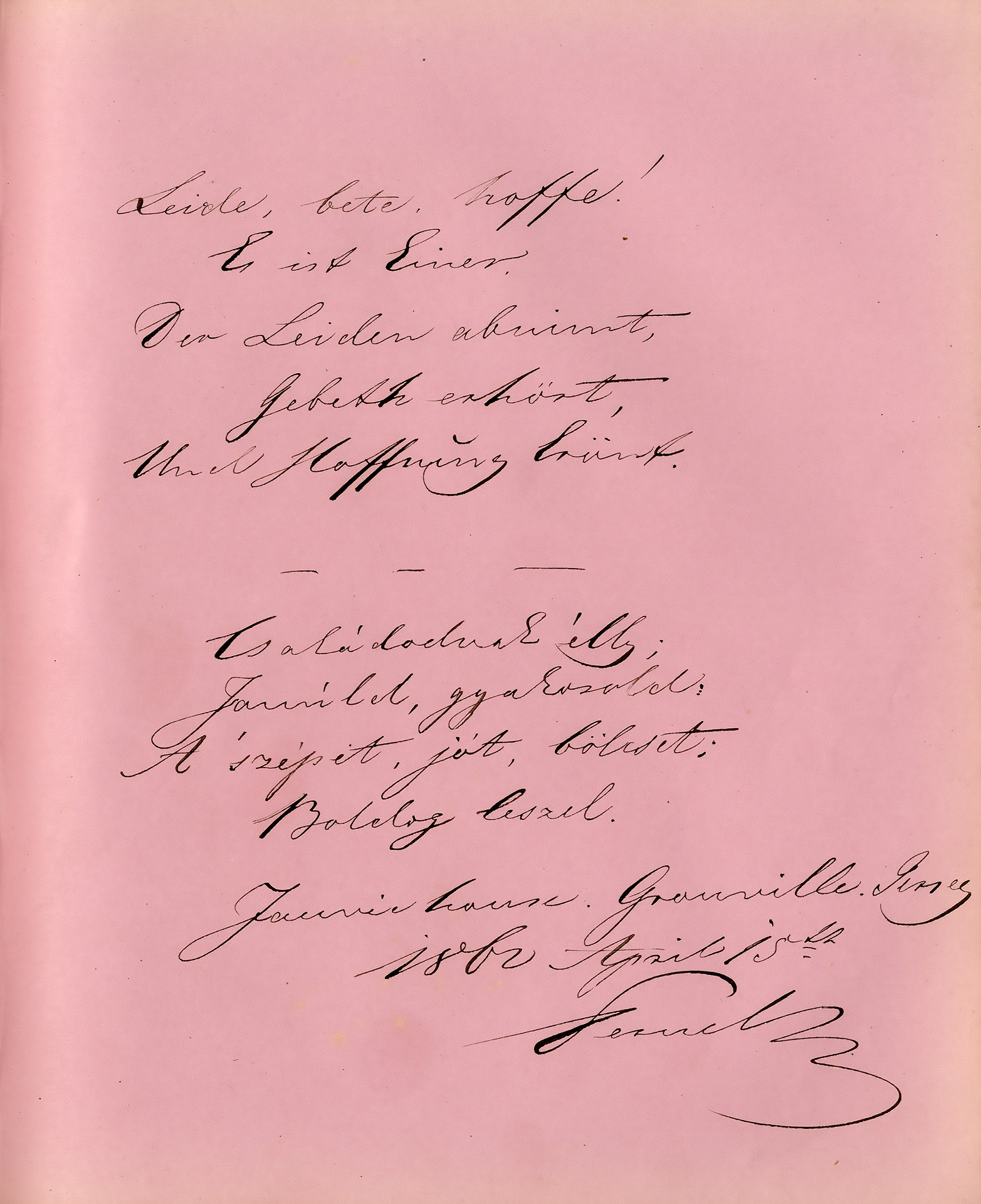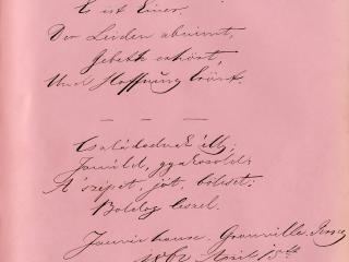 „Irma Perczel, with love and best wishes from her affectionete friend. Lilly Mackson (?) Woodlands Jersey May 21. 1861.” – szerint az emlékkönyvet Perczel Irma kapta egy kedves barátnőjétől 1861-ben Jersey szigetén. A következő néhány oldalon a 19. század második felében Európa-szerte is nagy népszerűségnek örvendő, amerikai költő, Henry Wadsworth Longfellow néhány versét olvashatjuk az ajándékozó kézírásával. A vaskos emlékkönyvbe az előbbi költeményektől eltekintve további bejegyzés alig került, a lapok többsége üresen maradt. Egy-egy oldalon szerepel Perczel Sándor és Erzse, Irma testvéreinek neve, illetve apjának, Mórnak az alábbi, német és magyar nyelvű sorai.