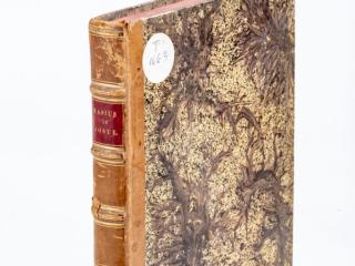 Típus: félbőr kötés, bordázott bőr könyvgerinc aranyozott díszítéssel, bőr sarkok, körülvágott, színezett lapszélek, 18. századi újabb kötéssel, nyomtatott könyvlapok