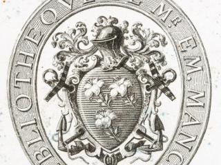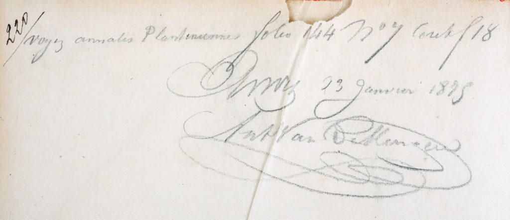 Bibliotheque de Mr. Em. Mancel”) a könyv egykori tulajdonosát jelöli. A szennylap egyik oldalán található a számunkra legfontosabb jelzés, egy kézírásos bejegyzés valószínűleg Wosinsky Mórtól, mely mutatja, hogy a kötet gróf Apponyi Sándor ajándéka a múzeumnak, tehát az ő gyűjteményéből származik ez a példány. A másik oldalon ceruzával írt Apponyi-korabeli feljegyzés található 1895. január 23-i dátummal. A címlapon látjuk a Tolnavármegyei Múzeum 1896-os pecsétjét, további possessori bejegyzéseket illetve Christophe Plantin híres antwerpeni nyomdász nyomdászjelvényét. A mintában látszik az alkotó kéz, ahogy a felhőkön átnyúlva, körzővel a kezében a teremtésen dolgozik. Körülötte a nyomdász jelmondata olvasható: „