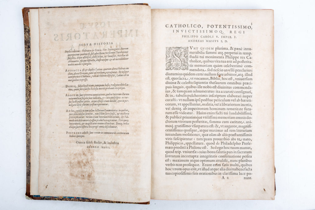 Andreas Masius, aki a mai Belgium területén született, 1514 és 1573 között élt katolikus pap, humanista és a szír tudományok jelentős képviselője volt, aki mindezek mellett a bibliafordításokkal is foglalkozott. Fontos szír nyelvészeti kutatásai voltak, többek között szír szótárt is szerkesztett. Legjelentősebb és a mai napig leginkább értékelt műve Józsué történetének megírása. A mű az ószövetségi Józsué vezér történetét dolgozza fel, aki az ókori zsidók vezetője volt honfoglalásuk idején, valamint Mózes utódja, aki átvezette népét a Jordánon és meghódította Kánaánt. A róla elnevezett szentírási Józsué könyve Kánaán meghódításának kezdetétől a Józsué haláláig terjedő időszakot meséli el. Masius műve több fejezetből áll: Józsué történetét héber és görög nyelven írja le latin fordításokkal, részletes magyarázatokkal és a bibliafordításokkal is foglalkozó bevezetővel. Az egyes nagyobb egységek díszes iniciáléval kezdődnek. A kötetet többféle mutató, jóváhagyás és II. Miksa német-római császárnak szóló ajánlás zárja. A kötet már csak Masius halála után jelent meg. Vitatott volt szabad magyarázatai, bibliafordítási és bibliaértelmezési gondolatai miatt.
