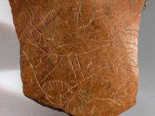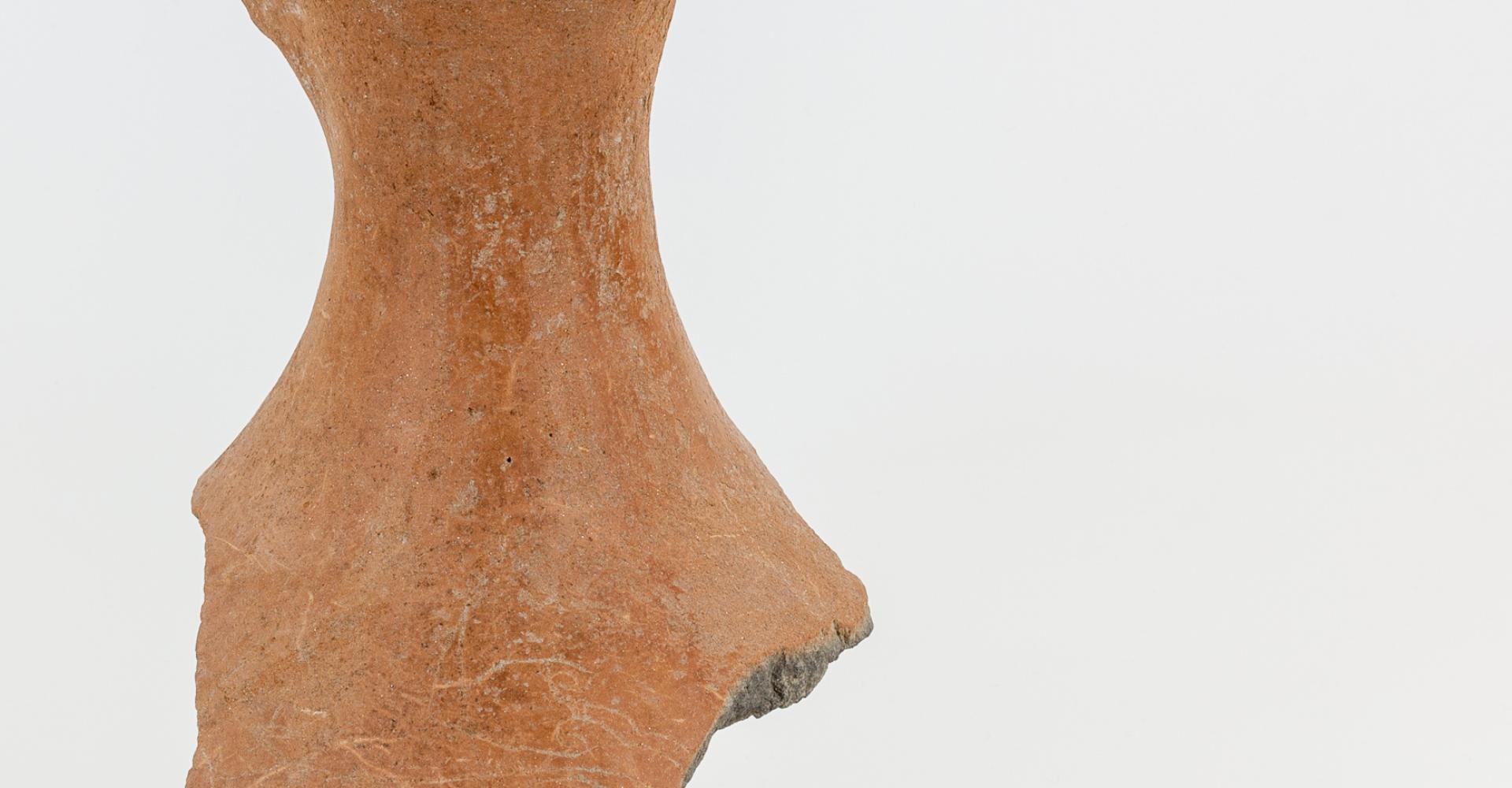 Leírás: Kancsó felső részének töredéke. Sötétszürke agyagból készült, homokkal, csillámmal soványított, felülete vörösre égett. Kerek száj, egyenes, felül legömbölyített peremmel. A perem 1 cm szélességű, amelyen egy enyhe horony fut körbe. A perem alsó széle megvastagított. A perem alól indult az ovális átmetszetű fül (letörött). A perem alól tölcséresen szűkül a nyak, majd erőteljesen szélesedik. A nyakon megfigyelhető, hogy a felületet fényesre sikálták. A has gömbös lehetett, csak egy töredék maradt belőle. Ezen a darabon egy bekarcolt lóábrázolást láthatunk. A ló fejét hátrafordítja, szája nyitott. A testén szíjazatok vannak. Mellső lábából csak a combrész maradt meg – hátsó része is hiányos az edény töredékessége miatt, a lórajzból a fara hiányzik, hátsó lábaiból a pata látszik. A farok a háta felett a felcsapva, egy szabályos levélmotívumot formáz.