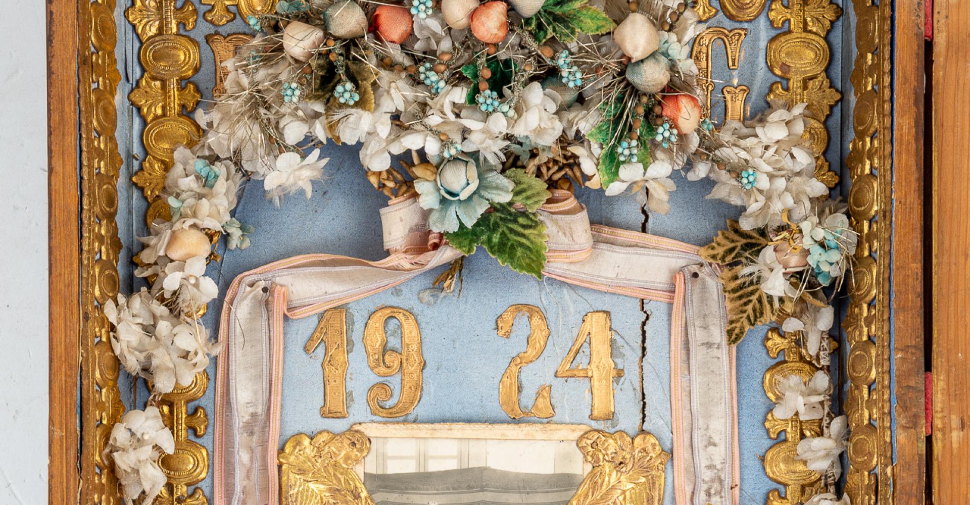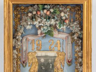 Augusztus hónap műtárgya egy Tolna megyéből származó menyasszonyi koszorú, melyet a leszármazottak a vőlegénybokrétával együtt őriztek meg.