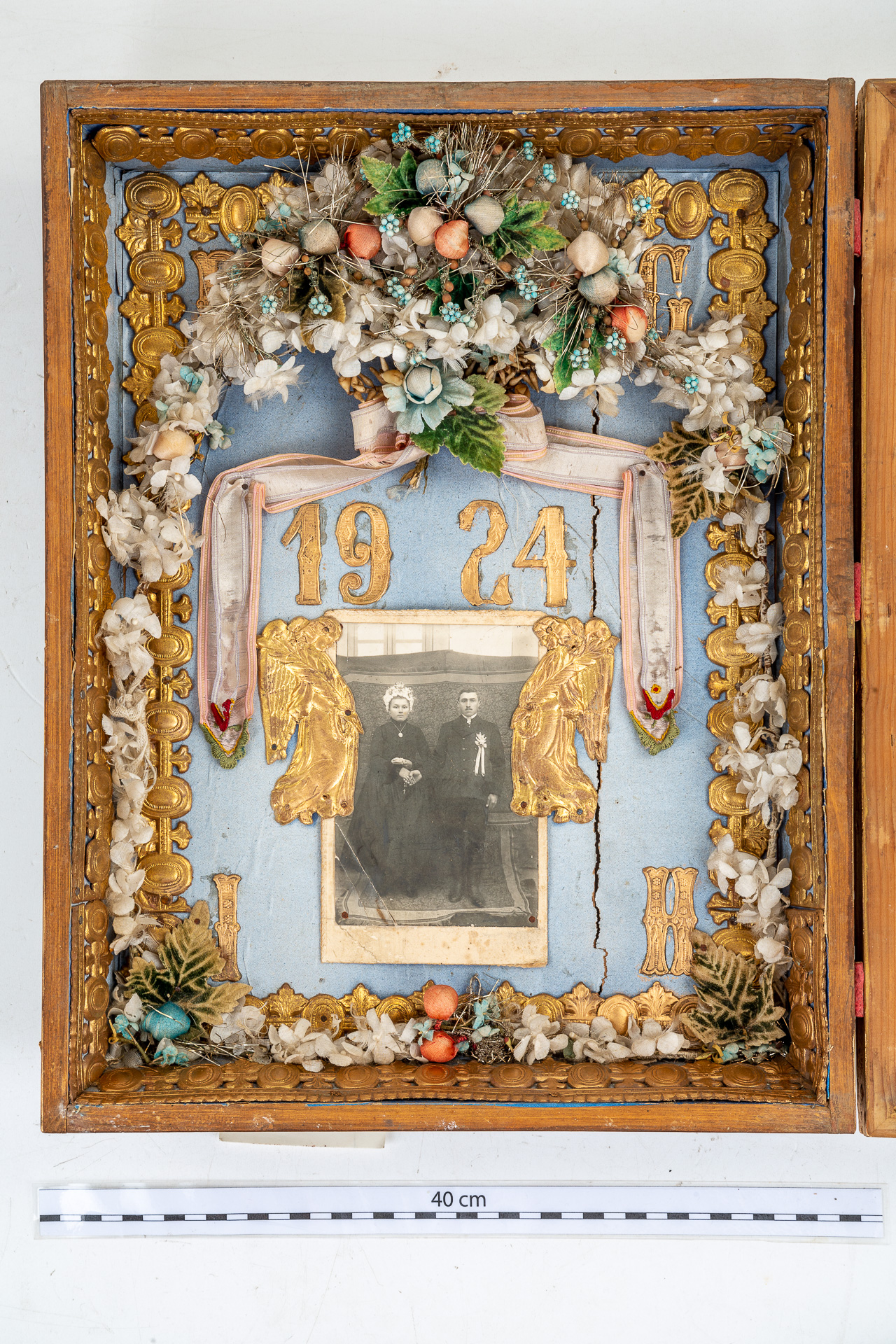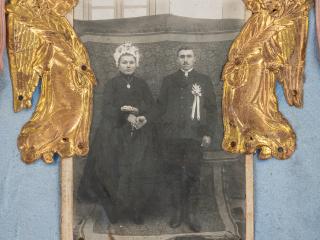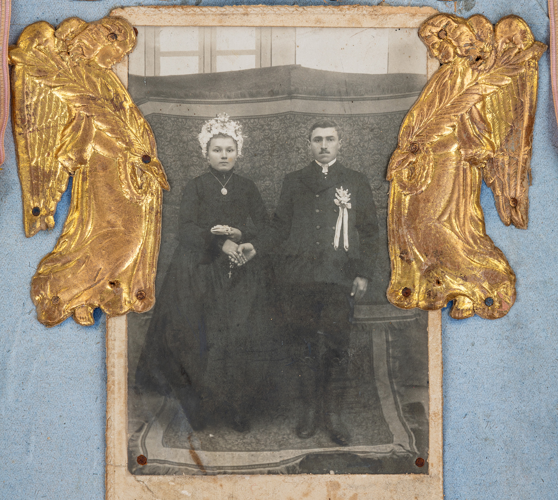 Bár a dobozkán belül található fotón látható fiatal pár neve és lakhelye ismeretlen, pár dolog elmondható róluk. A kép mellé helyezett aranyozott angyalok jelenléte, az asszony puritán, polgári stílusú, fekete ruhája, rózsafüzére katolikus házaspárra utal. A vőlegény öltözete egyértelműen paraszti életmódot tükröz: csizmanadrág hosszú szárú bőrcsizmával. A képet nem műteremben készítették, hanem valószínűleg saját házuk tornáca előtt. A szokásnak megfelelően hátuk mögé és a földre két, nagy méretű abroszt terítettek háttér gyanánt, mely inkább a paraszti, parasztpolgári mentalitás jellemzője volt.