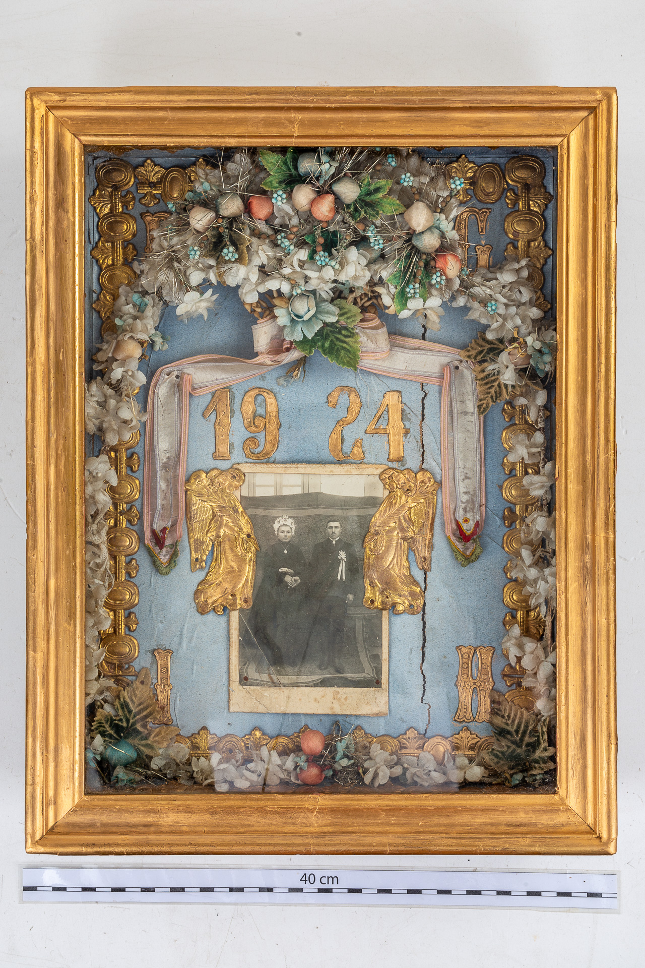 A házassággal életük jelentős fordulópontjához érkezett a fotón látható ifjú pár. Az esemény és a tárgyak jelentőségét mutatja, hogy a menyasszonyi koszorút a vőlegény bokrétájával, az esküvői fényképpel együtt asztalos által készített üvegajtós szekrénykében helyezték el, melyet nagy becsben tartottak. A tisztaszoba falán a családi fényképek, szentképek között kapott helyet.