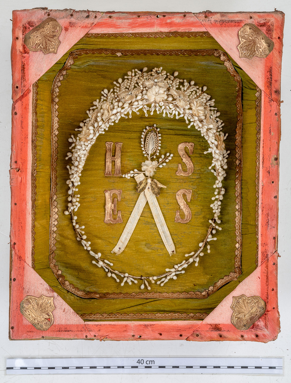 A gazdagon díszített láda belsejét kék papírral bélelték ki, belső oldalát pedig aranyozott szegélydísz keretezi. A fadoboz négy sarkában a házaspár nevének kezdőbetűit (fent: P.C., lent: I. H.), középen pedig házasságkötésük évszámát (1924) tüntették fel aranyozott betűkkel és számokkal. Kinézetével ellentétben a műtárgy aranyozott részei nem fémből, hanem préselt, színezett kartonpapírból készültek, melyeket a korabeli szatócsboltokban árultak, csakúgy, mint a koszorúhoz és bokrétához szükséges alapanyagokat is.