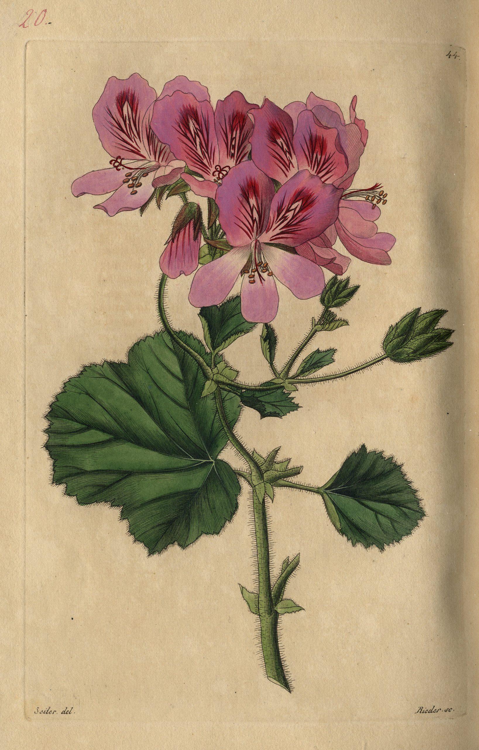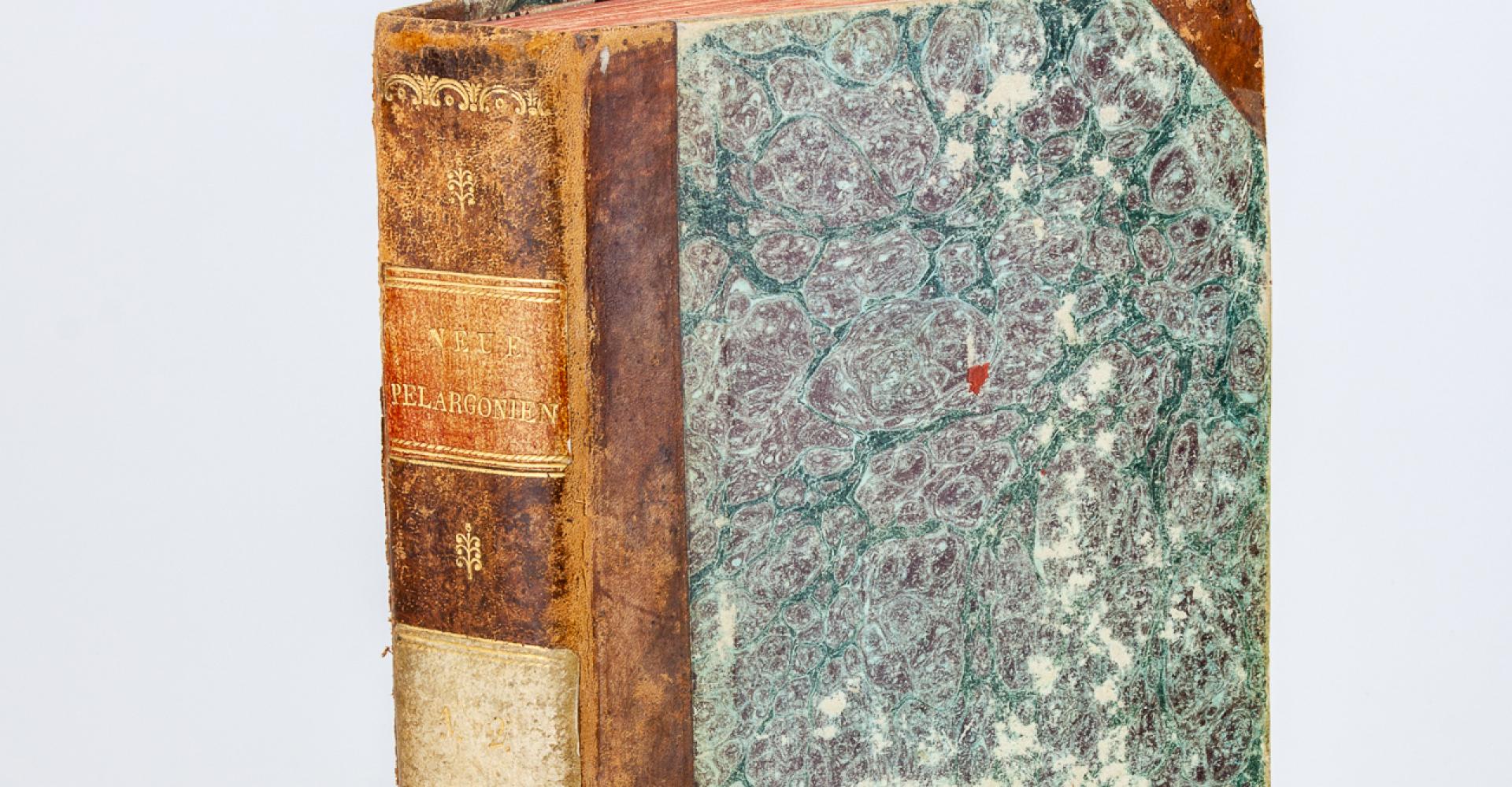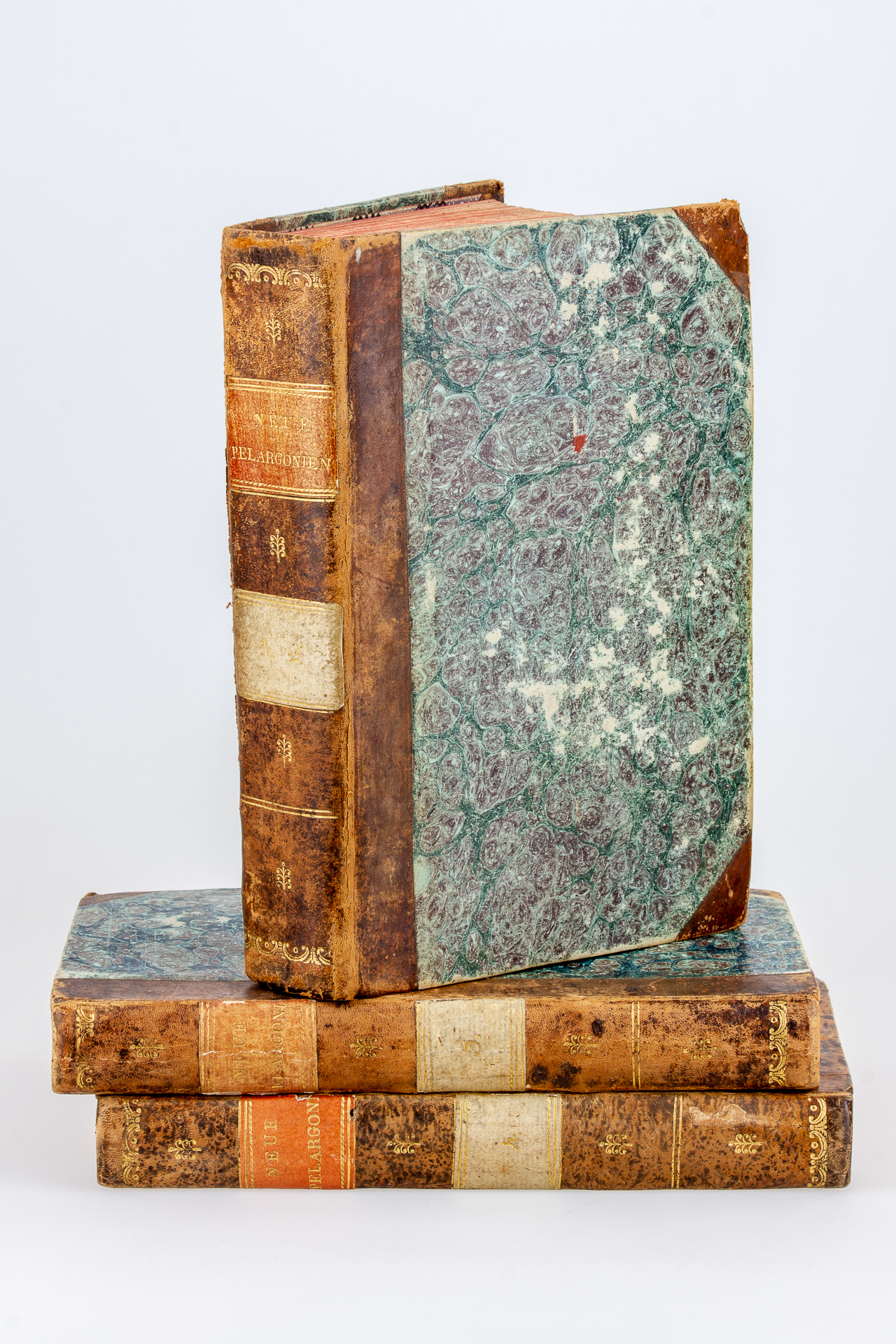 Neue Arten von Pelargonien”. Az eredetileg 6 kötetes műből (1825-1843) 3 beleltározott példány található itt meg. Az első két kötet egybe van kötve. A címoldal után a német Kertészeti Társaság ajánlása következik az olvasóhoz. A több oldalas bevezetőben Trattinick hangsúlyozza a természettudományok, főleg a botanika fontosságát, e tudományterület részletesebb megismertetését. Kiemeli, hogy már az ókori kultúrákban is foglalkoztak a kertészet alapjaival, a virágok sokféleségével, szépségükkel, művészi voltukkal, gyógyhatásukkal. A kötetekben a muskátli nemzetséget emeli ki más virágfajtákkal szembeni sokféleségük miatt. A kötetekben jellemzi az egyes fajokat és egyenként színes ábrákat is kapcsol hozzájuk. A muskátli az 1600-as években Angliából indult hódító útjára, elsőként Leiden város botanikus kertjébe. A