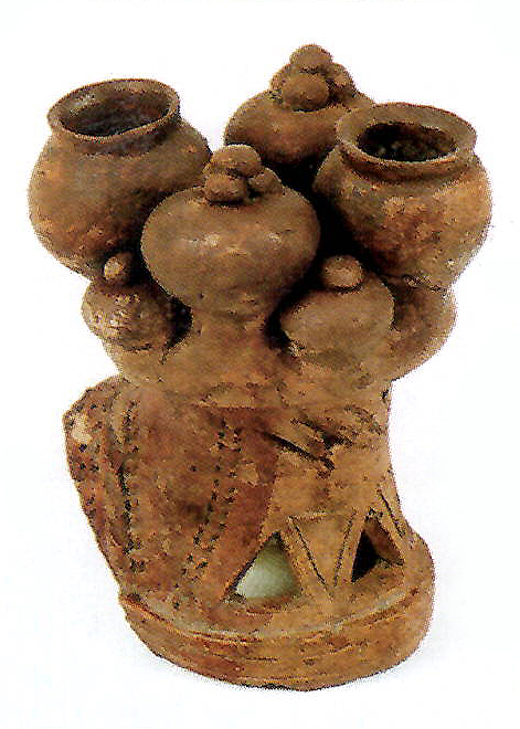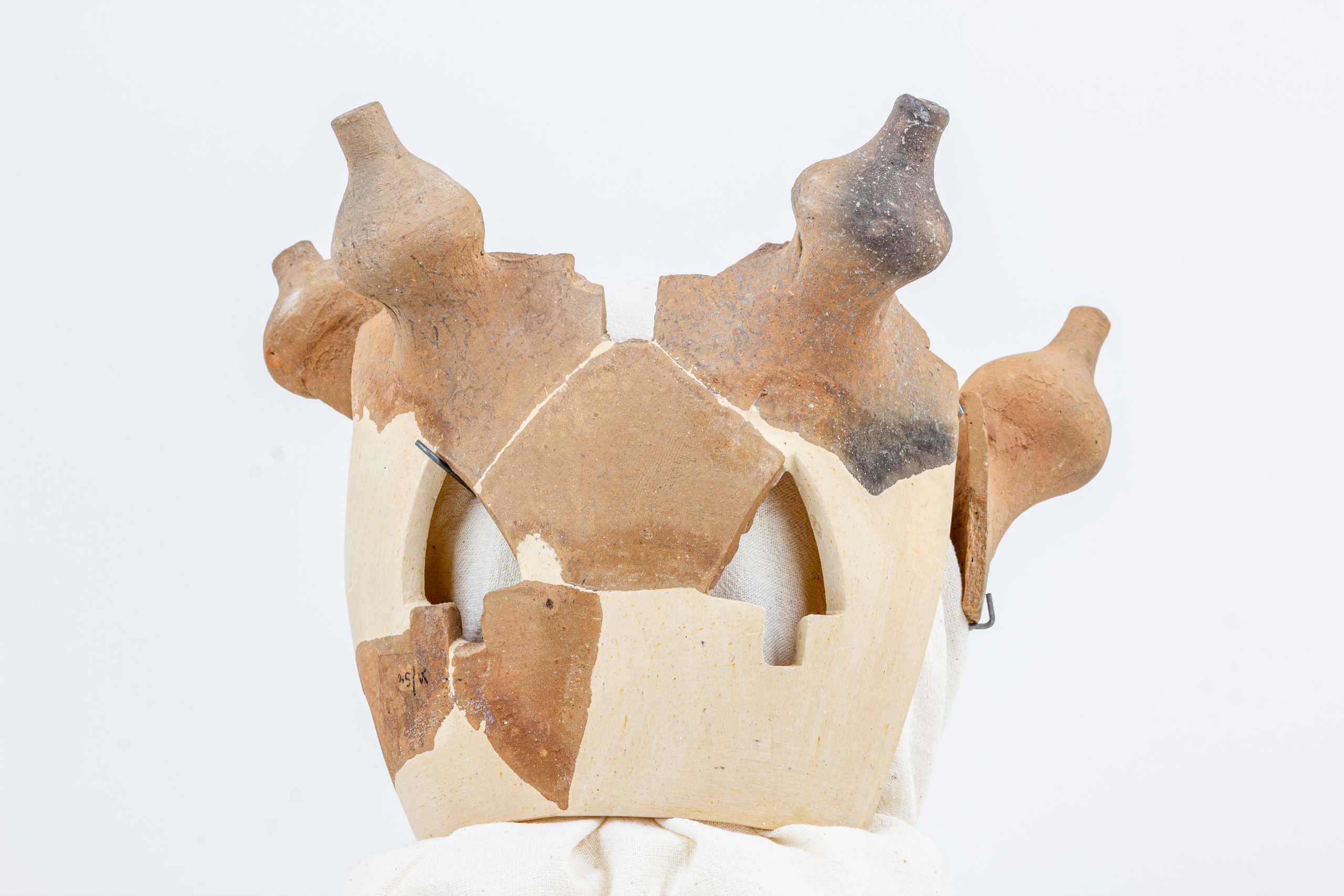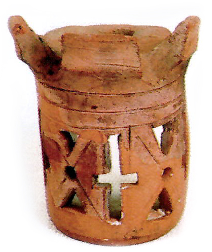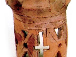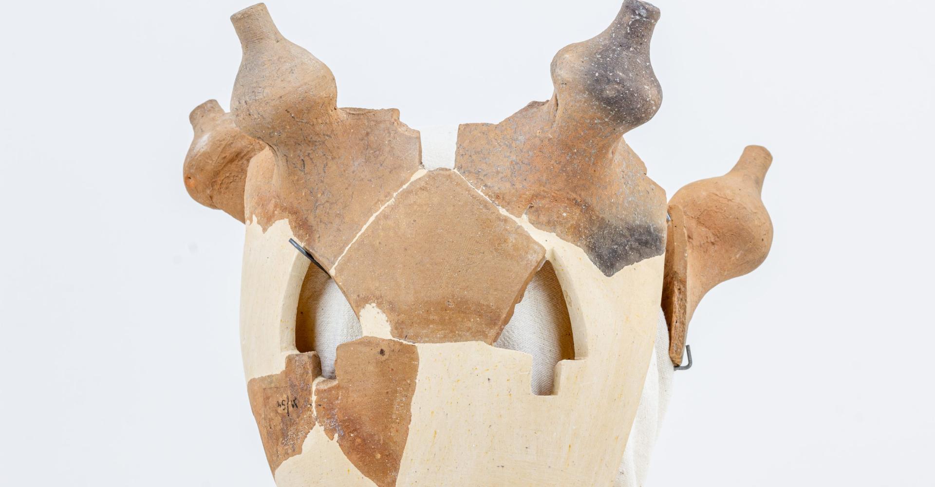 Leírás: hengeres palásttal, gyorskorongon készült tárgy darabjai. A palást belső oldalán finom korongolásnyomok láthatóak. A paláston kívül, szabályos elrendezésben korongolással készült, csúcsos, gombszerű rátétek láthatóak. A paláston, a gombok közötti részeken, legalább két sorban nagyjából egyenlő szárú háromszög formájú, levélszerű kivágások láthatóak, amelyek alul, a háromszögek talpán középen négyszög vagy téglalap alakú kivágásban zárulnak, mintegy szárként. A levélszerű kivágások közül többnek csak a részletei figyelhetők meg. A paláston még nyers állapotban vágták ki a mintát. Az oromdísz palástja külön, enyhén domború testként készült, arra illesztették rá egyenletes távolságban a szintén külön korongolt gombokat, majd a felületet lesimították.