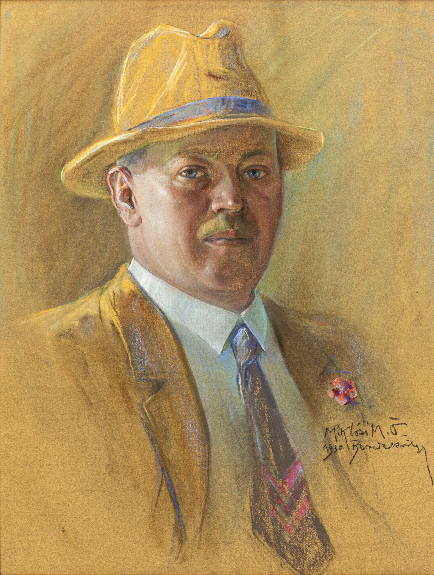 Hónap műtárgya január Miklósi. M. Ödön: Mészöly Miklós szüleinek portréi, 1930 Papír, pasztell, 45 X 65 cm Mészöly-letét 2496, 2497   Miklósi M. Ödön szekszárdi festőművész rajzolta meg Mészöly Miklós szüleinek, Molnár Sándornak (1881–1947) és Molnár Sándorné Szászy Jolánnak (1898–1983) portréit. (Az író Molnár Miklós néven született, 1947-től használta apai nagyanyja családnevét írói névként.) Miklósi M. (Mutschenbacher) Ödön (1881−1942) szekszárdi festőművész. Először az Iparművészeti Iskolában tanult másfél évig, majd Vajda Zsigmond festőművésznél képezte magát. 1903-ban iratkozott be az Országos Magyar Királyi Mintarajztanodába és Rajztanárképezdébe, ahol többek között Zemplényi Tivadar, Tardos Krenner Viktor voltak a tanárai. Tehetsége hamar megmutatkozott, több iskolai díjat és ösztöndíjat is nyert. Másodéves korától állított ki a Műcsarnok tárlatain. 1908-ban fejezte be tanulmányait, utána ismét Szekszárdon élt. 1913–14-ben olaszországi tanulmányutat tett. 1922-ben meghívták Hollandiába, ahol nagy sikert aratott festményeivel. Több jelentős Tolna megyei személyiség reprezentatív portréját készítette el a vármegye és a városháza számára. Ezek közös jellemzője a szokatlanul erőteljes színvilág. Az arcképfestészet realista hagyományát követte a személy ábrázolásában és beállításában, ugyanakkor harsogó színekkel jelenítette meg a környezetet és a hátteret. A város számos lakójáról rajzolt arcképet, tehetős polgárokról és szegény emberekről egyaránt. Ezeket a pasztellrajzokat finom, harmonikus színvilág jellemzi. A modellek személyiségét is érzékletesen bemutató portrék Miklósi emberábrázoló tehetségéről árulkodnak. Molnár Sándor és felesége portréja 1930-ban készült. A férfi arcképe az aláírás tanúsága szerint augusztusban a Benedek-völgyben, valószínűleg a Molnár-tanyán készült. A rajz kidolgozottsága, finom részletei, arra utalnak, hogy a festő műtermében készítette el a rajz végleges változatát. A sárga felöltős és kalapos férfi portréjának leghatásosabb részlete a férfi kissé melankolikus tekintete. Molnárné Szászy Jolán arcképén is a szem, a tekintet a domináns. A divatos frizurájú, sötét hajú asszony hatalmas kék szemei mosolytalanul, szinte riadtan néznek a szemlélőre. Fedetlen vállát és mellkasát légiesen gomolygó, fehér, áttetsző muszlin borítja. A kendő jobb oldalát két rózsa látható, alóla pedig átsejlik kék ruhájának keskeny sávja.   Molnár Sándor, Mészöly édesapja, 1888. április 8-án született, Molnár Sándor madocsai lelkész és Mészöly Hermina gyermekeként. 1906-ban érettségizett a Szekszárdi Állami Főgimnáziumban, 1910-ben szerzett gépészmérnöki oklevelet. 1910 őszén önkéntesként vonult be a haditengerészethez, 1910–11-ben Pólán kapott tiszti képzést. 1913-ban a Zenta cirkálón zászlósként szolgált. 1914 tavaszán már a Szekszárd-bátai ármentesítő és belvízszabályozó társulat mérnökeként dolgozott. 1914 novemberétől önként vállalta a városi mérnök helyettesítését, közel négy éven át nyújtott segítséget a jéggyár és a villanytelep működtetéséhez. 1919 decemberében választották meg az ármentesítő társulat főmérnökévé, 1920-ban igazgató-főmérnöki kinevezést kapott. Munkáját lelkiismeretesen végezte, szakmai tudása elismertséget szerzett számára. Mint igazgató főmérnöknek egyre több lett a társadalmi kötelezettsége és tisztsége, különböző szervezetek nevezték ki választmányi-, vagy felügyelőbizottsági taggá. 1922-ben a Szekszárdi Református Olvasókör választmányi tagja lett. 1912-től tagja, majd 1924-től több éven át háznagya volt a Szekszárdi Kaszinónak. 1922-ben segítette a Turul Sport Egylet megalakulását, majd 1932-ban az utód szervezet „boxoló” szakosztályának alapító elnöke lett. 1930-tól néhány évig a Szekszárdi Dalárda alelnöke is volt. Az 1938-ban megalakult Légvédelmi Liga tanácstagja és működésének lelkes szervezője volt. Szenvedélyes vadászként a húszas évek közepétől évente vett részt a szekszárdi elit számára rendezett körvadászatokon. Molnár Sándor 1917 novemberében jegyzete el Szászy Jolánt, Szászy Endre neves szekszárdi ügyvéd és Stepke Mária legidősebb lányát. Jolán 1898. július 20-án született, tanulmányait a szekszárdi Polgári Leányiskolában végezte. Tehetséges zongoristaként többször lépett fel az iskolai ünnepélyeken, az volt a vágya, hogy zongoraművész lesz. Molnár Sándor és Szászy Jolán 1918 júniusában házasodtak össze a szekszárdi református templomban. Első gyermekük, Dénes, 1919-ben, Miklós pedig 1921-ben született. Sándor és Jolán házassága az 1930-as években megromlott. „A fiatalasszony már azokban az években boldogtalan, a repülésből és álomból semmi nem lett; a kiismerhetetlenül hallgatag, kétségbeejtő predesztinációt sugárzó férfi biztos támaszként magasodik mellette, mint a védtelen rejtőzés kálvinizmusa. Hab és jéghegy parabolája.” − írta Mészöly Anyasirató című novellájában. Szöveg: Lovas Csilla Fotó: Retkes Tamás
