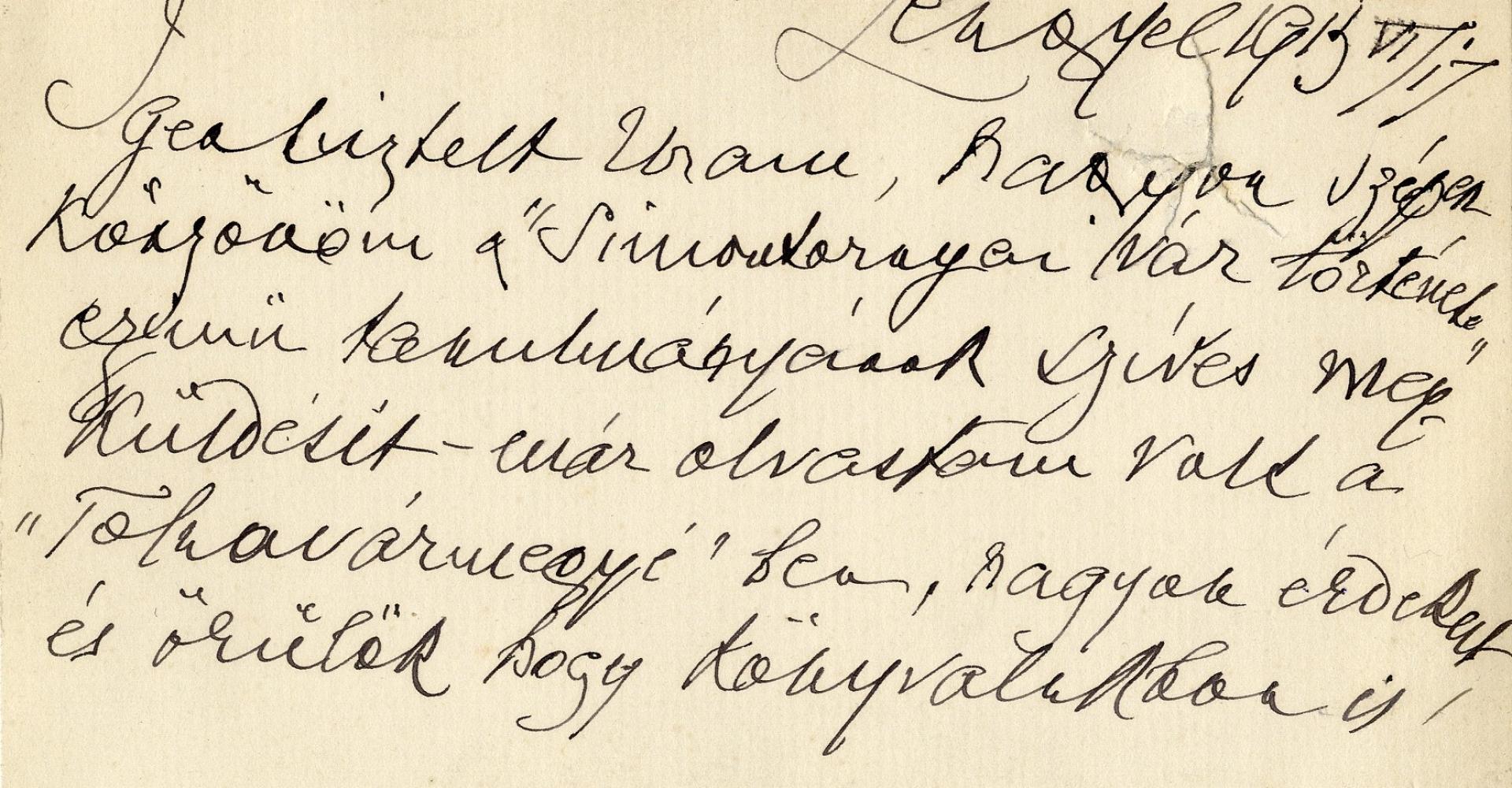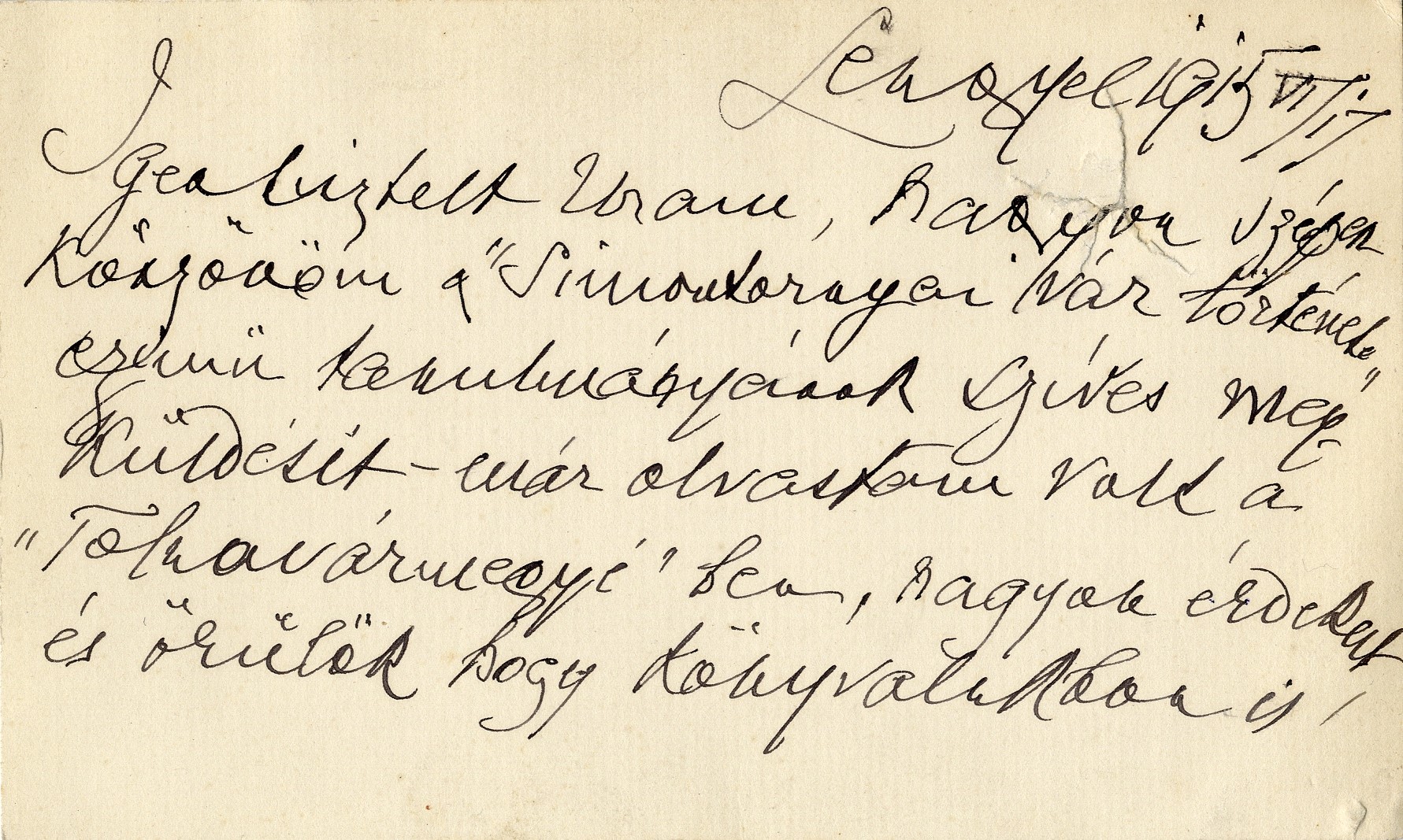 Lengyel 1915 VI/17. Igen tisztelt Uram, nagyon szépen köszönöm a »Simontornyai vár története« című tanulmányának szíves megküldését – már olvastam volt a »Tolnavármegyé«ben, nagyon érdekelt, és örülök, hogy könyvalakban is bírom. Szívélyes üdvözlettel tisztelője Apponyi Sándor.”A borítékot Apponyi saját kézzel címezte meg.A levelet a postabélyegzők szerint június 18-án adták fel és 19-én érkezett meg Simontornyára. A boríték és levélpapír a mélynyomott rész alapján Teichner Gyula budapesti papír- és írószerkereskedő terméke. A papír és boríték alsó sarkához közel szakadás figyelhető meg. Egy másik, hasonló módon kiszakadt, átadott iratra ifj. dr. Kiss feljegyezte, hogy 1944–1945-ben, a front alatt az íróasztal fiókjában szilánktól sérült. Ez alapján valószínűsíthető, hogy Apponyi levele is ekkor rongálódott meg.