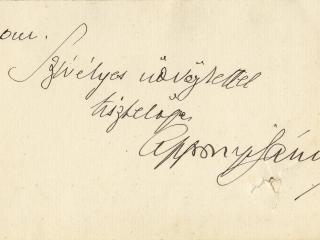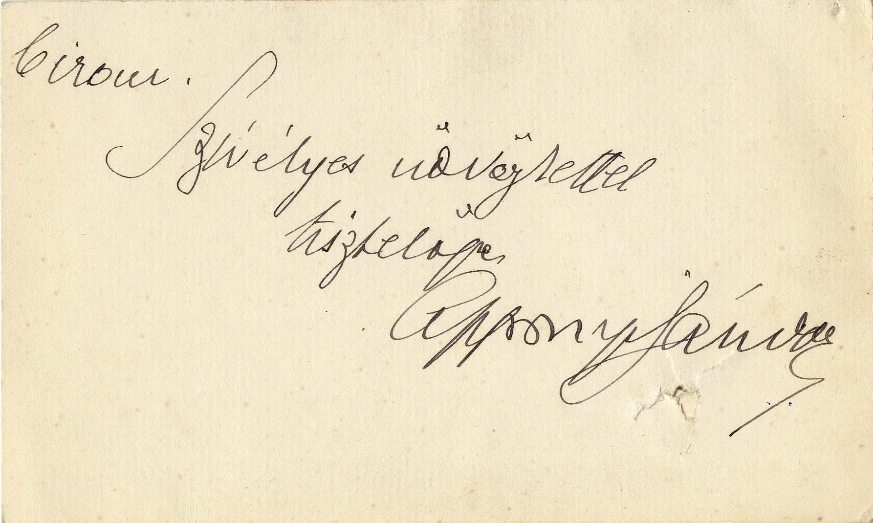 A dr. Kiss Istvánnak szóló és részben általa írt levelek között szerepel gróf Apponyi Sándor köszönőlevele, borítékkal együtt. Szövege a következő. „