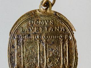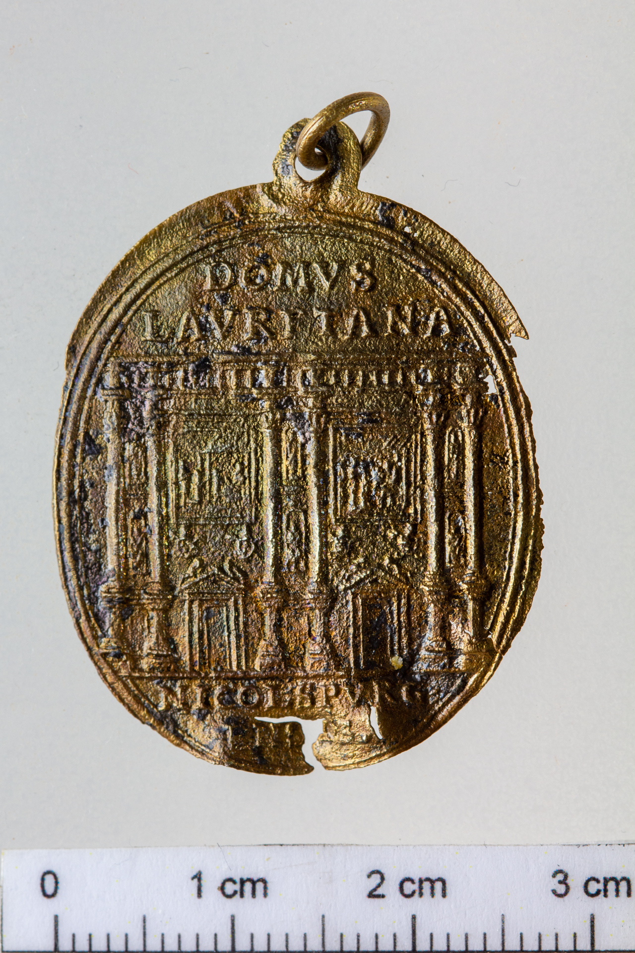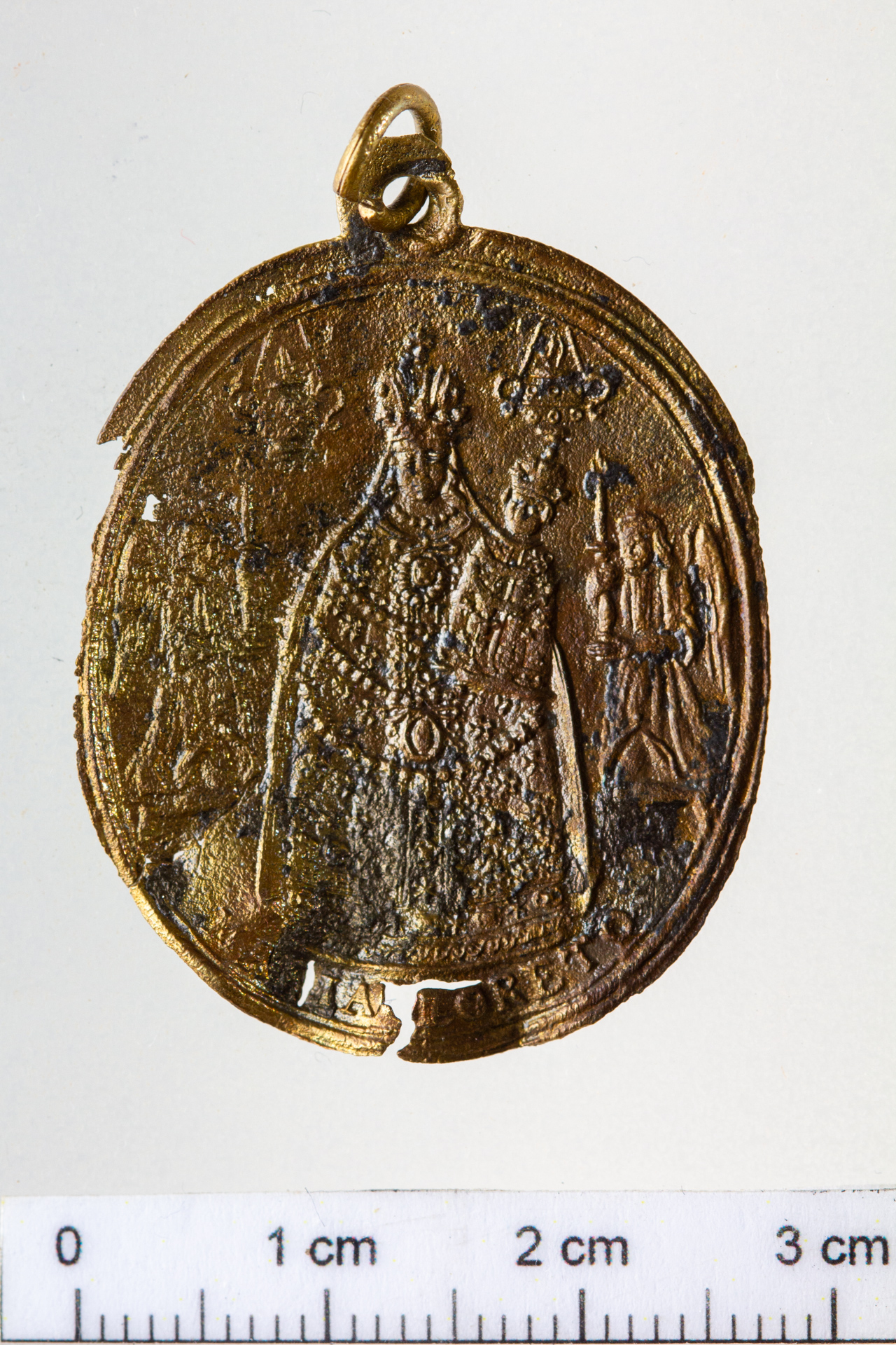 A tárgy leírása: ovális alakú, öntött, vékony, sárgarézből készült. Felső részén félkör alakú, apró, kerek lyukkal ellátott nyúlvány látható, benne vékony, kerek átmetszetű kis karikával, mely a felfüggesztést szolgálta. Enyhén deformálódott, sérült, hiányos. Méretei: 3,2×2,8 cm. Függesztőfül hosszúsága: 0,5 cm. Karikaátmérő: 0,6 cm.