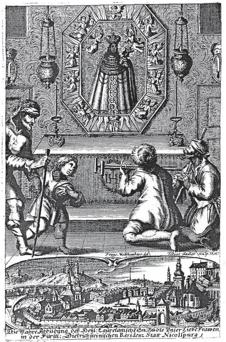 Másik oldalán a nikolsburgi Loreto kápolna látható a DOMUS LAURETANA NICOLSPURG ENS?B felirattal.