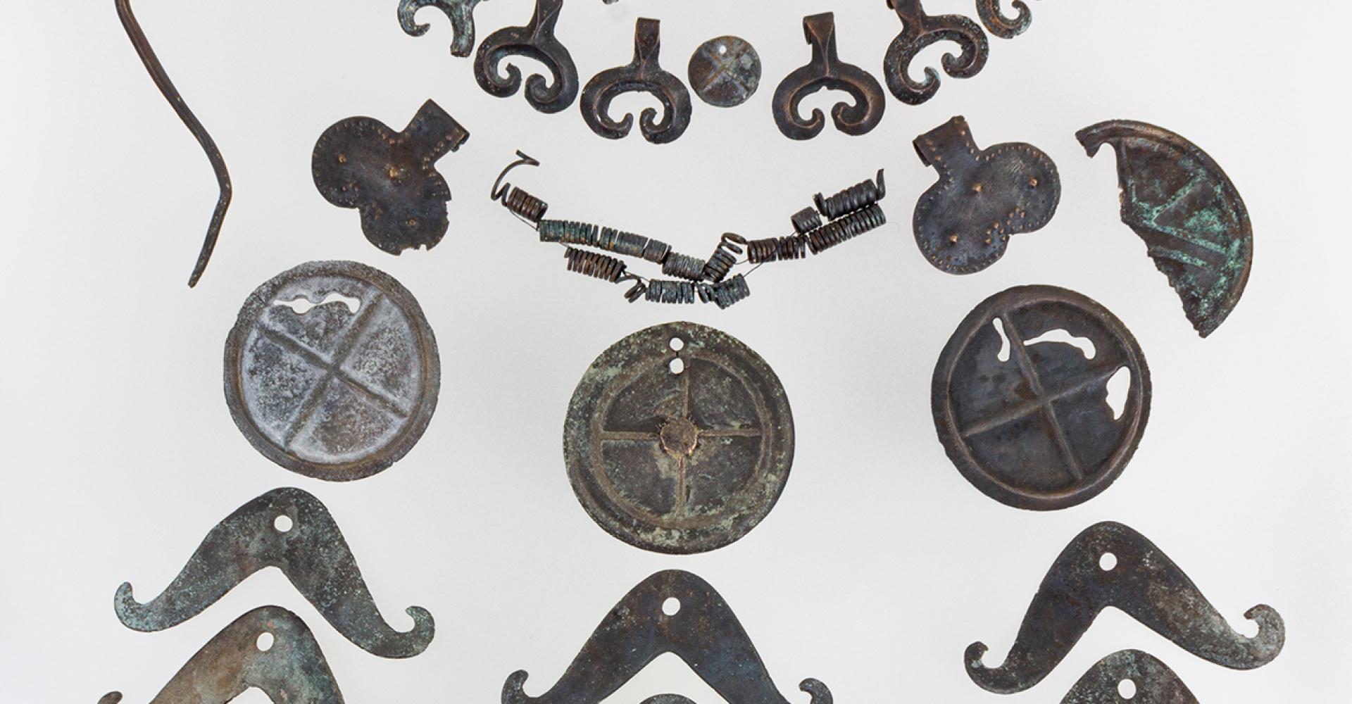Anyaga: A hatvan bronz tárgyból álló kincsleletben az egységesen bronzból készült díszítmények technológiai szempontból két csoportra oszthatók: kalapálással készült (spirálisan tekercselt gyöngyök, pitykék, korongfejű tű), valamint öntött tárgyakra (fordított szív-, félhold- és Ω alakú díszek).