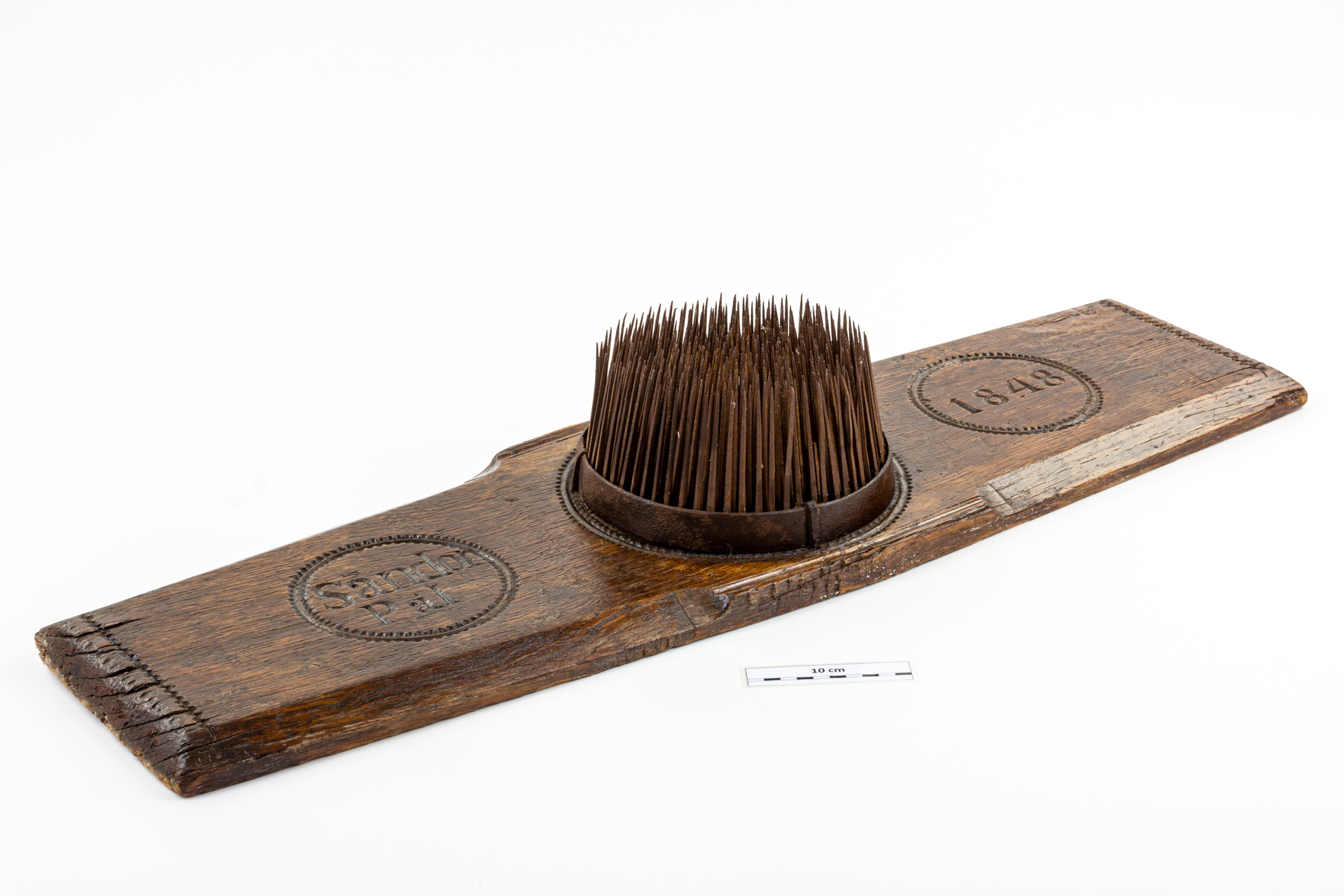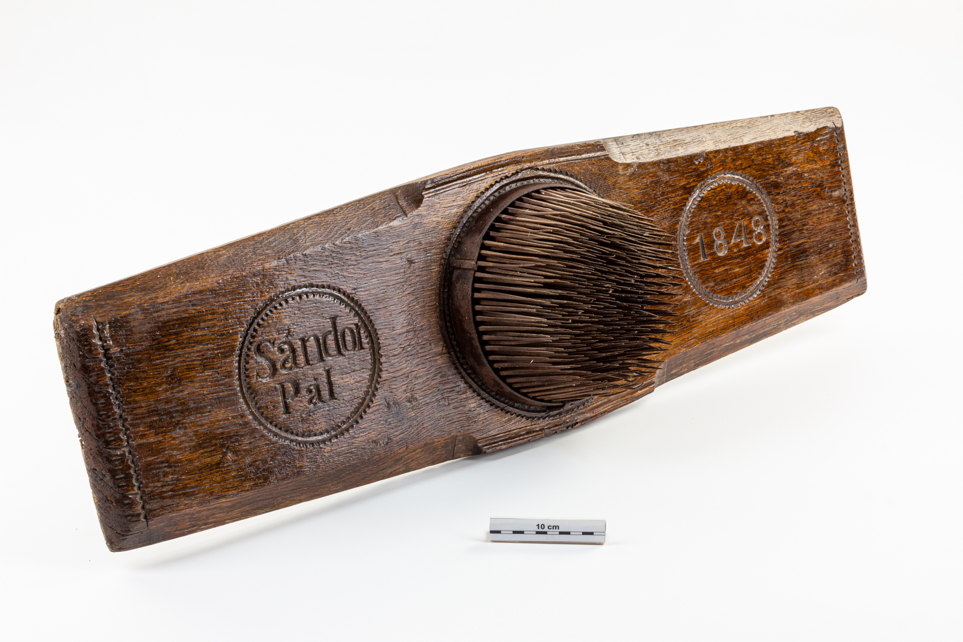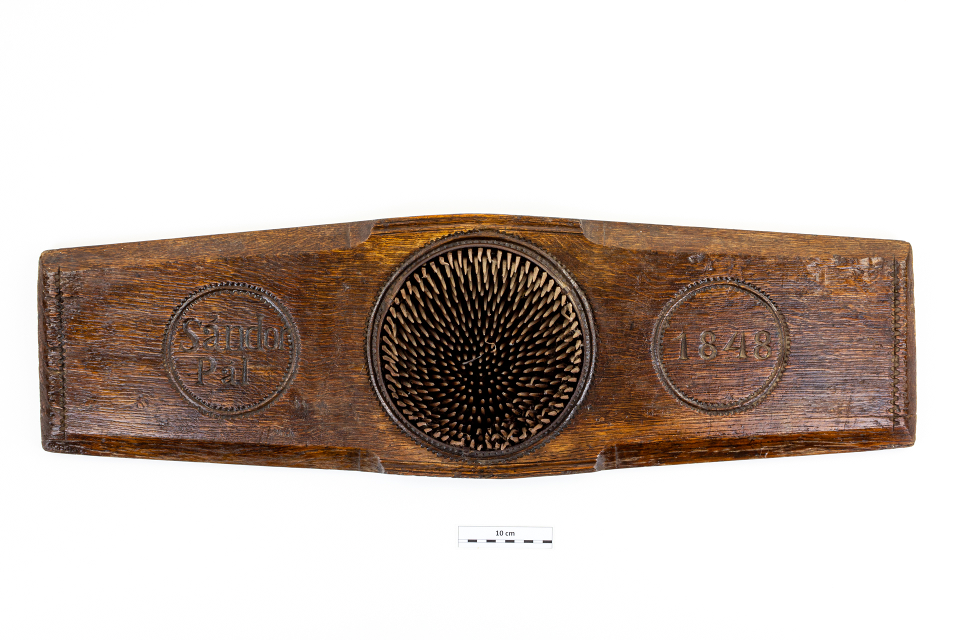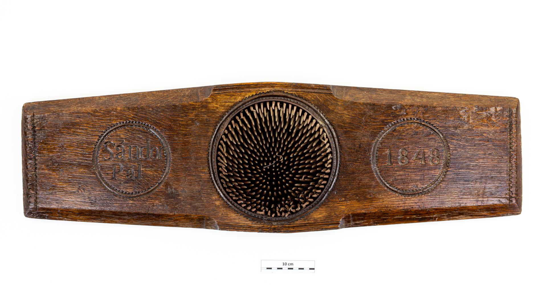 1848”-as évszám. Sándor Pál 1820. november 22-én született Decsen Sándor Pál és az őcsényi származású Görcsös Erzsébet gyermekeként. A tárgy generációról generációra a családban öröklődött, 2021 őszén került a néprajzi gyűjteménybe Tikos Sándortól.